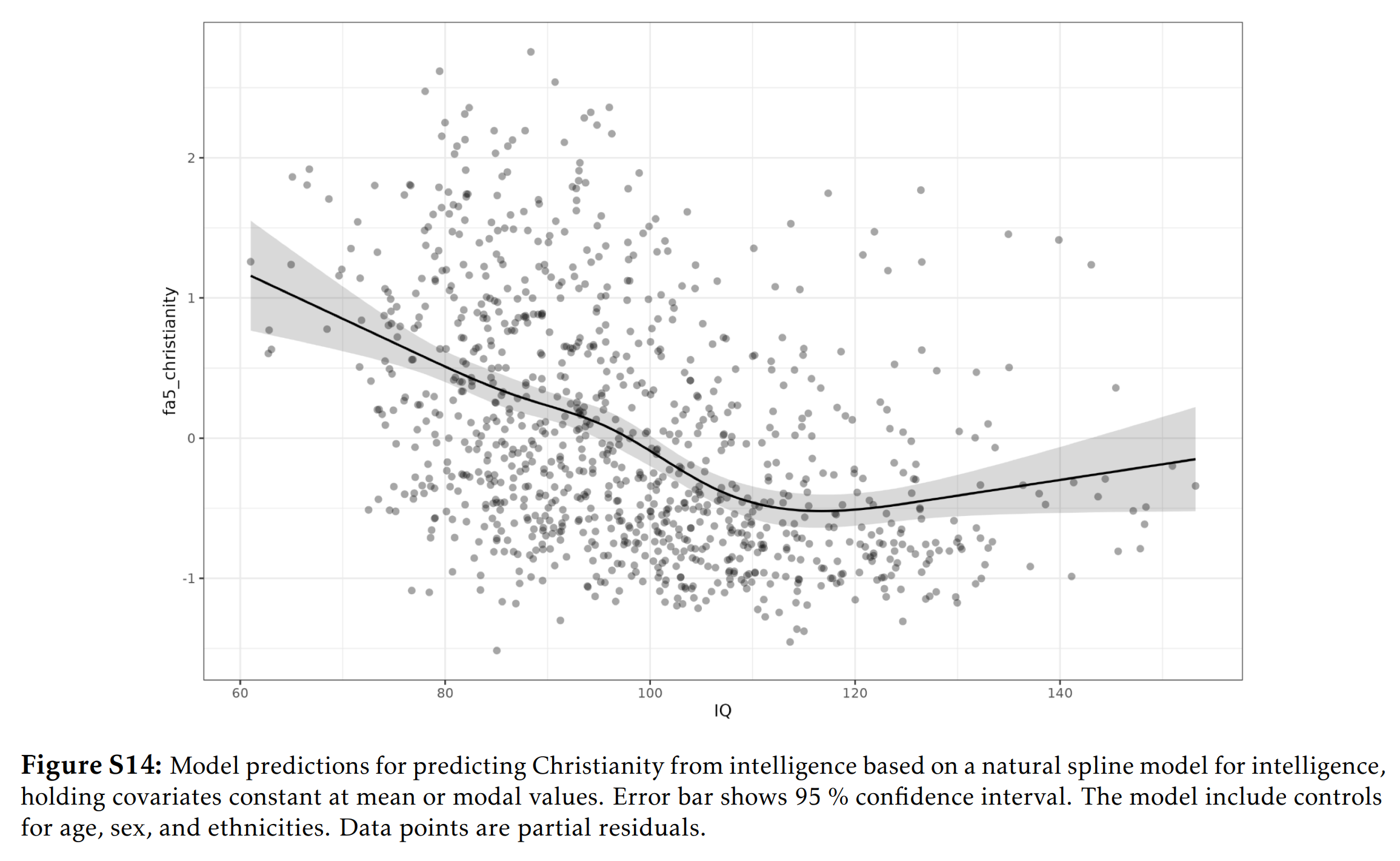It turns out that the first factor was still a general factor and was almost entirely consistent across these analyses (r’s 0.96 to 1.00). Furthermore, nonlinear patterns were detected of intelligence on these scores as well. Some of these minor factors also showed a similar non-monotonic pattern, like the one for Christianity:
