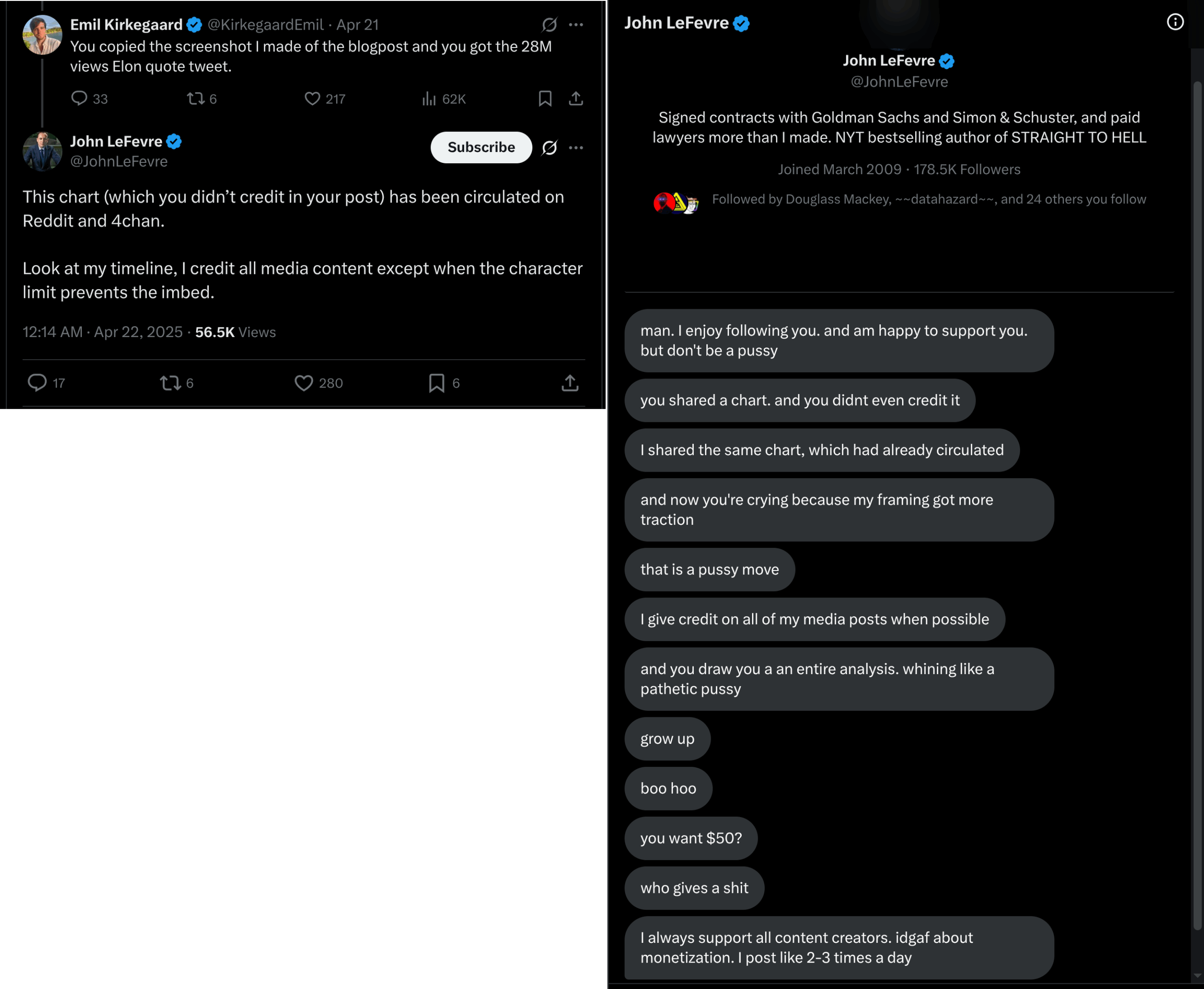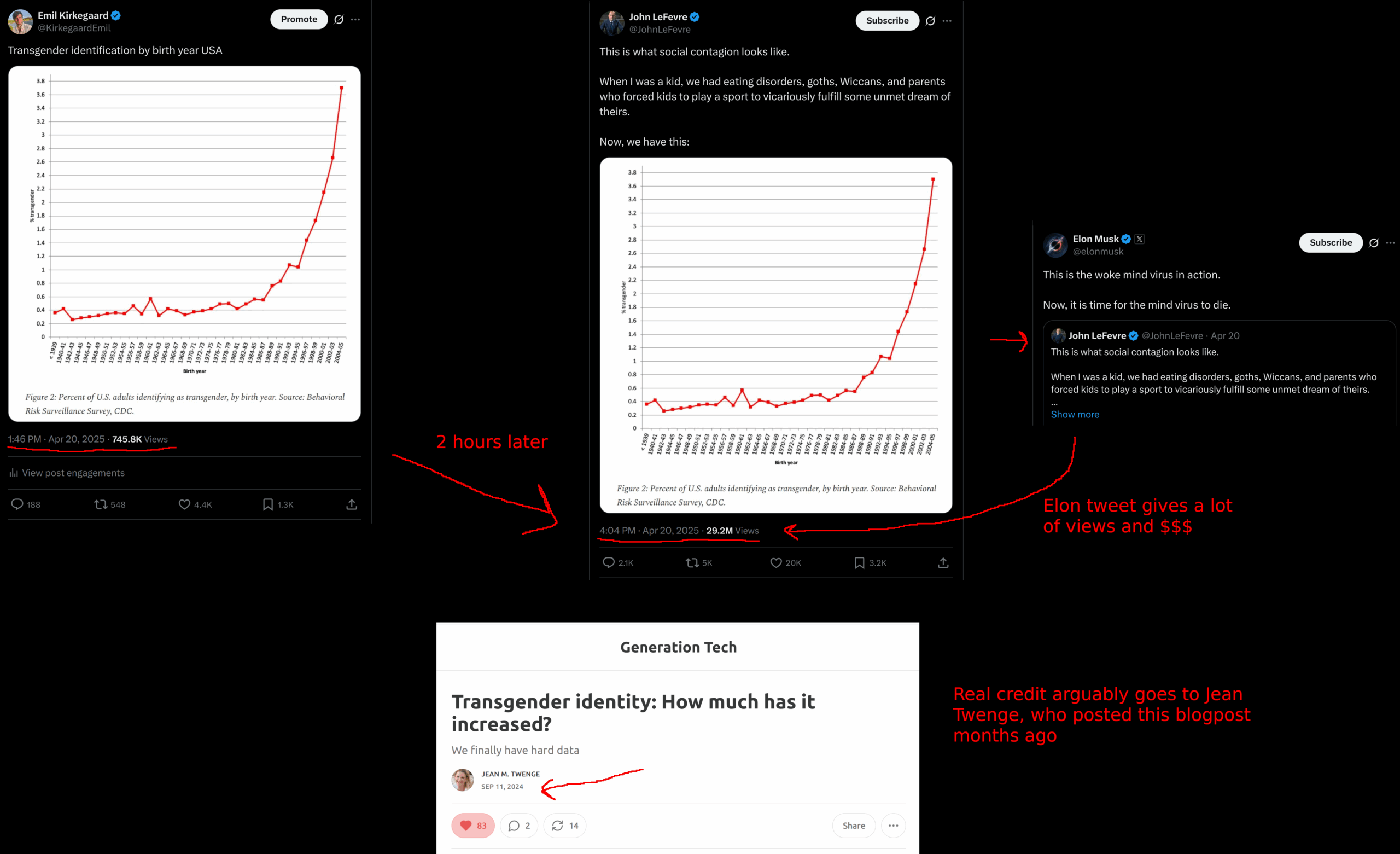 To give an example. The other day I was reading random Substack articles, and their algorithm suggested me a post by Jean M. Twenge from September 2024 about the rise of transgender identity in the US. It had a stunning plot, so I posted it on X and it went viral (826k views currently). 2 hours later, user John LeFevre reposted my screenshot to his larger audience. He hit the jackpot as Elon Musk saw it and quote tweeted it, giving it 41M views (38M from Musk). Someone noticed and sent it to me, so I told LeFevre that he did a dick move. Rather than admit, he decided to lie about it.