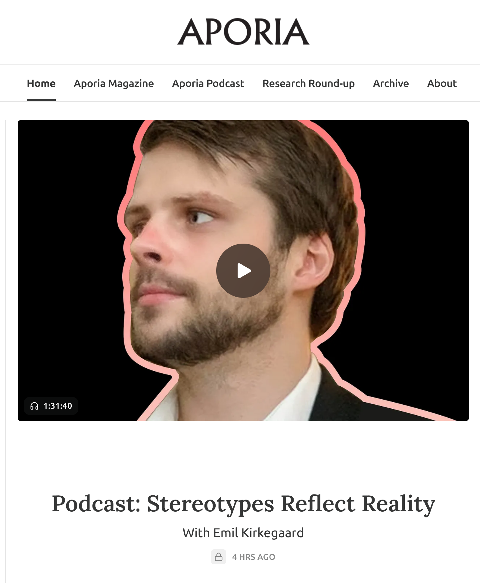 My interview with Noah Carl over at Aporia Magazine has just been released. This was 90 minute long interview where we discussed the historical background of stereotype research, the evolutionary foundations of stereotypes as part of the more general pattern recognition selection, what current research shows (my own included), and the usual academic leftist politics. It’s paywalled though, but you should be subscribed to Aporia anyway. :)