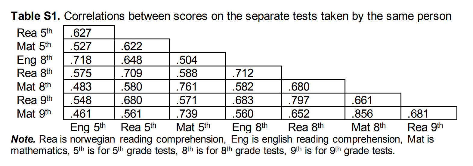 Using data from “everyone who took national tests between 2007 and 2019 (N = 936,708). As the tests are taken by more than 95% of children going through the Norwegian school system, our sample is largely free from sampling biases.”, they can calculate all sorts of correlations. Some examples: