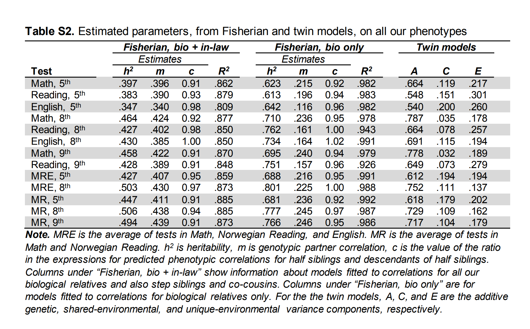 For some reason, they did not calculate parent-child and parent-parent correlations. While the tests were taken in their teens, presumably some of these people have become parents already, so we should at least be able to get the phenotypic parent-parent correlation (the observed assortative mating correlation).