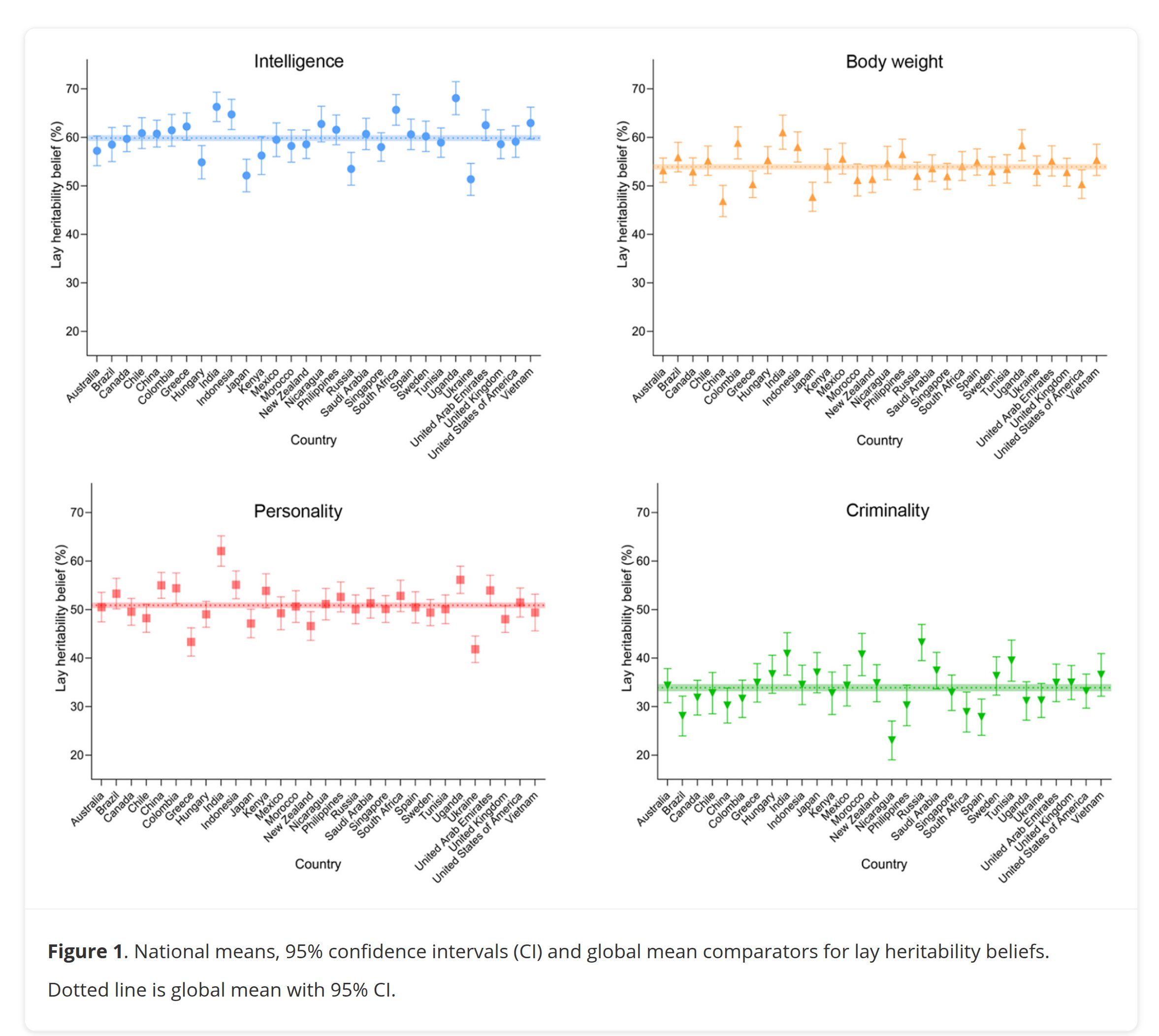 He cites no data to support this, and one can question it based on modern data. Take this 2024 survey of people across 30 countries concerning the heritability of various traits: