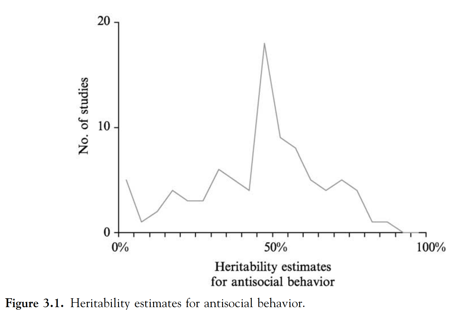 There is good reason to think this is a stark underestimate because antisocial behavior is very difficult to measure well and measurement error causes heritability to be underestimated (A and C too low, E too high). There’s only one study I know of that used multiple indicators to measure a latent antisocial trait. I wrote about it some years back, here’s the summary: