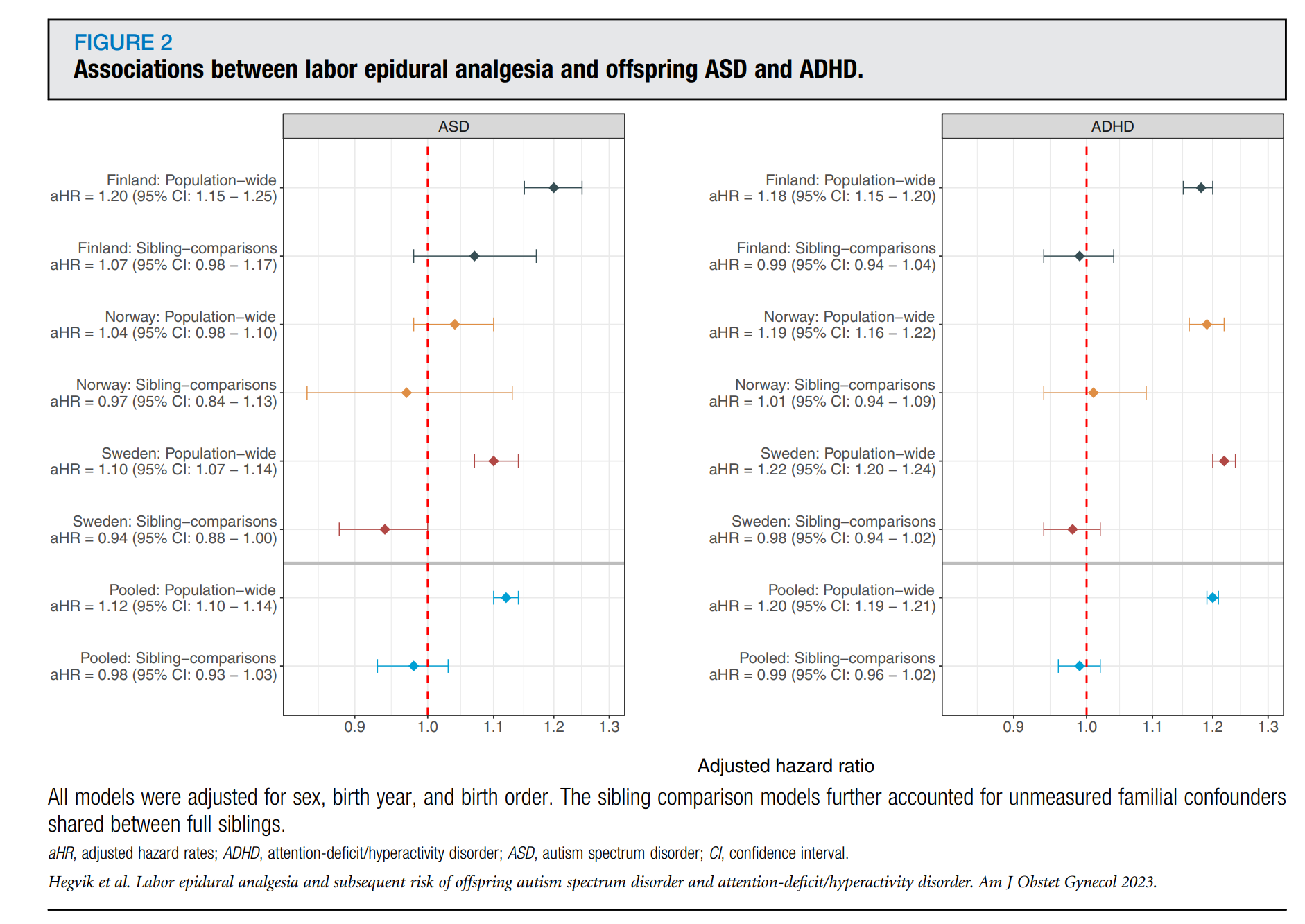 Giving birth is a painful affair as has been long noted (genesis: in sorrow thou shalt bring forth children). So what if we give women effective painkillers (in the spinal cord) to reduce this pain? Well, some research suggested this might damage the children. This puts women in a tough situation: pain or risk their children? Hegvik et al 2023 decided to look at this using siblings from Finland, Norway, and Sweden (there’s a Danish replication as well). Replicating earlier findings, they found that epidural use was associated with 12-20% higher odds of offspring getting an ADHD or autism diagnoses. However, when they looked at siblings only, they found nothing.