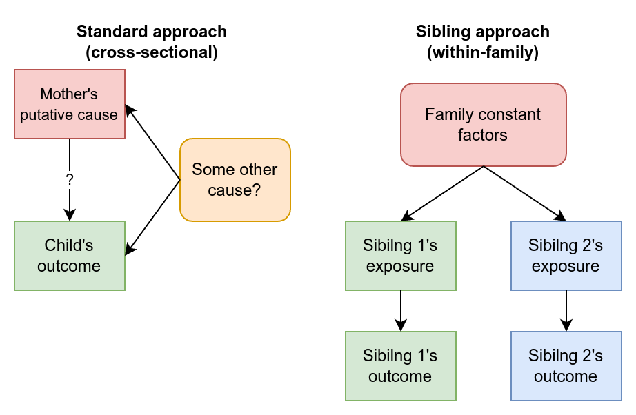 There’s a very large literature on the outcomes of children to mothers who did X. The problem with most of these is that mothers who do and don’t do X are not necessarily otherwise comparable to mothers who didn’t do X. In other words, the primary problem of social science applies, that of self-selection. So what can we do about this problem? Well, nature has been kind enough to make siblings. They are very useful because they don’t differ in certain ways. They have the same parents, and thus the same expectation of genetic scores for every trait. They don’t actually have the same actual genetic scores (genetic potential), of course, but on average they do. Their genetic differences are due to the randomness inherent in the making of gametes (recombination). This is very important because this means the genetic variation among siblings cannot in general be caused by anything the parents do (except genetic methods!). As such, siblings gives us a near-perfect control for certain kinds of parental behaviors, including prenatal. These cannot otherwise be easily studied without the self-selection issue.