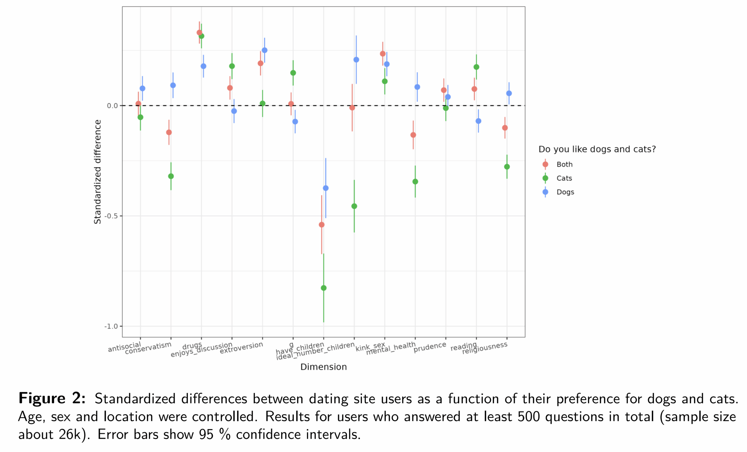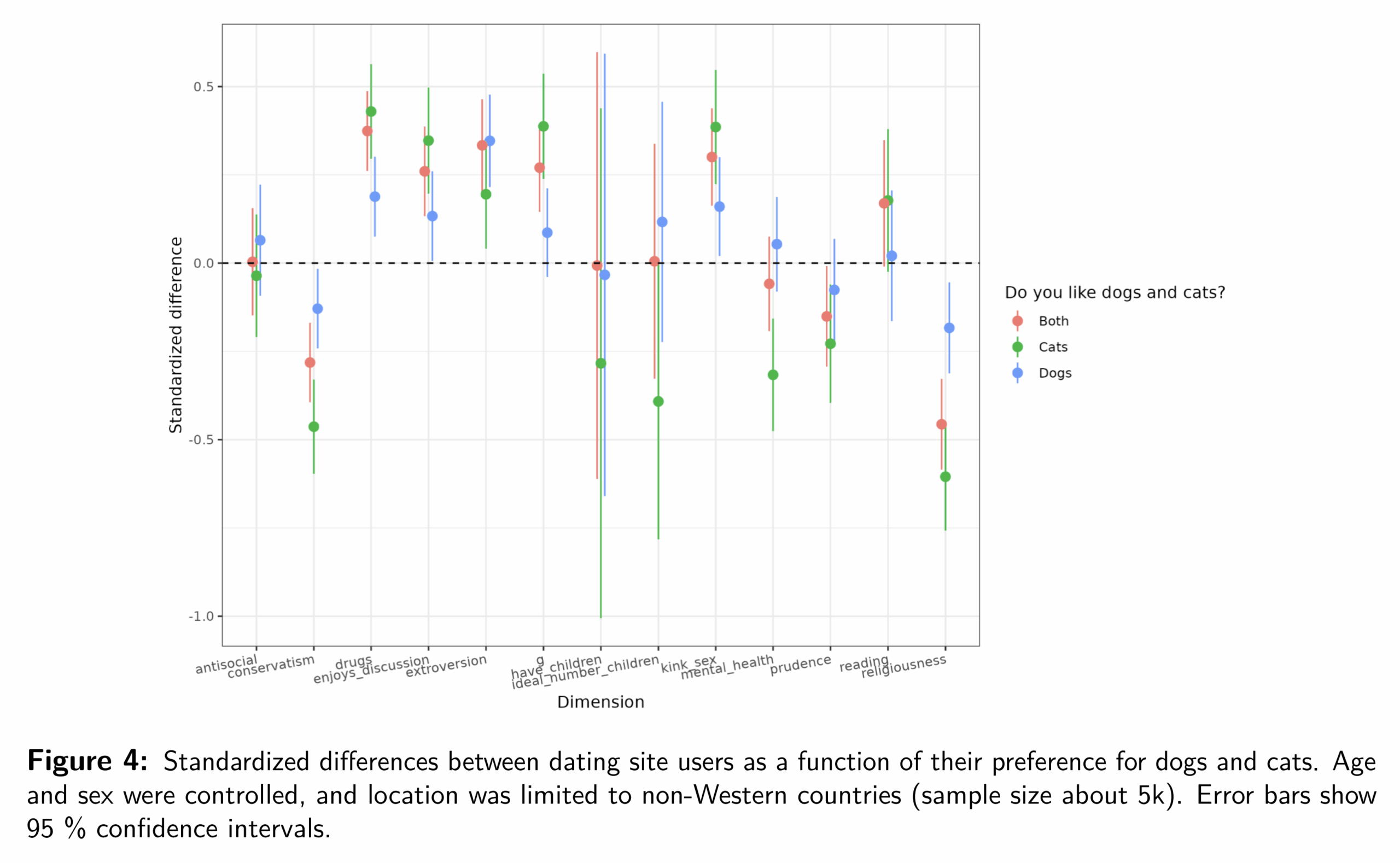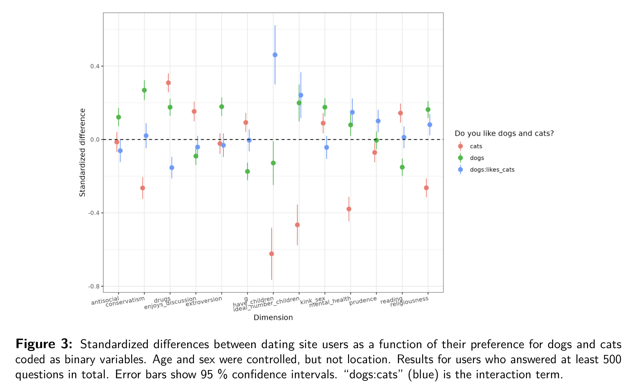 The comparison group is people who don’t like either dogs or cats (which is the 0 line). This choice is arbitrary (probably grand mean coding could make a more intuitive plot). In any case, these results are controlled for age and sex, but nothing else, including not for where people live. Of the larger differences, we see familiar (get it?) patterns: