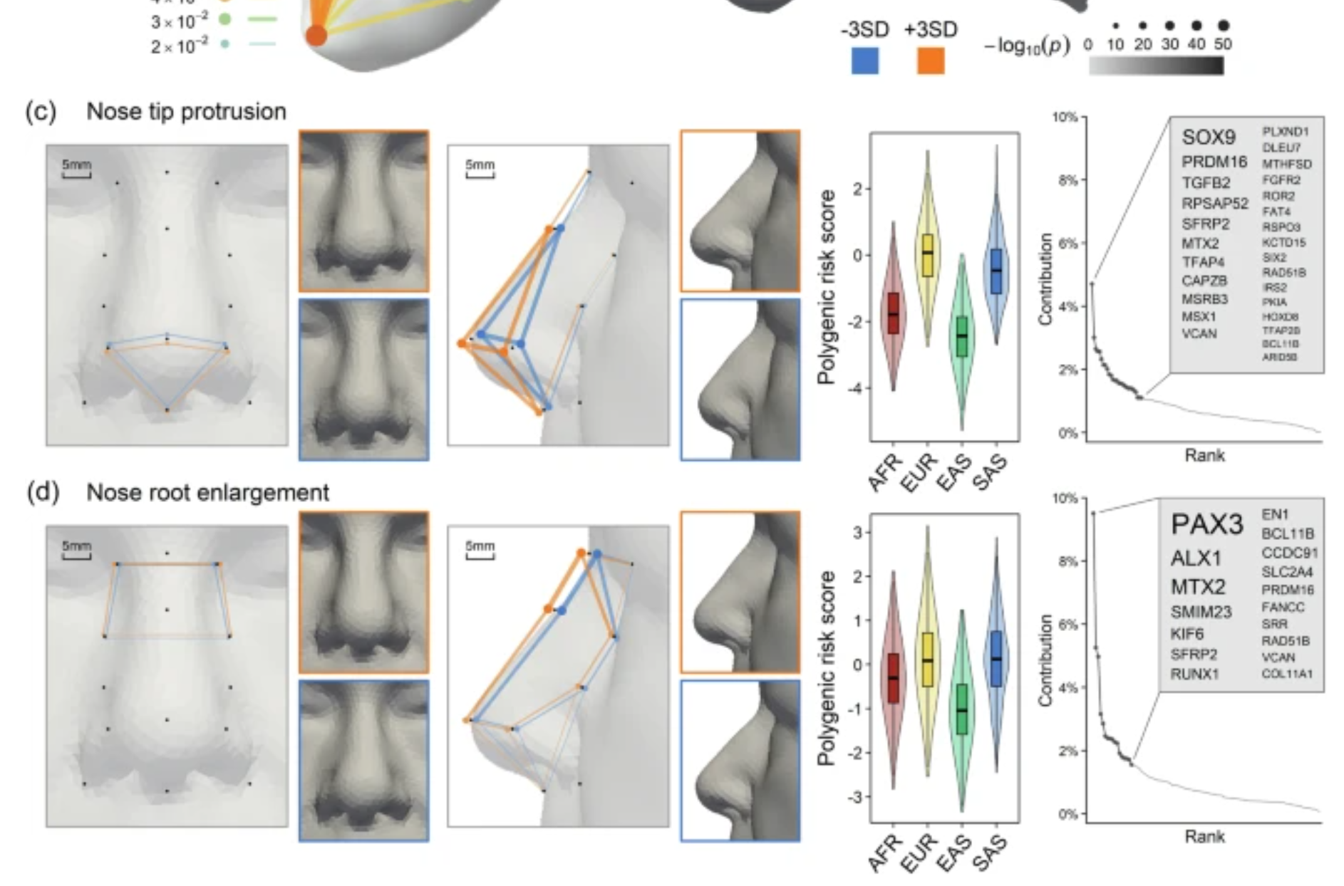 Although our targeted SNPs may have higher MAF in EUR because they were identified through a European-based C-GWAS, a recent large-scale face GWAS conducted in East Asians22 identified 244 face-associated SNPs and found evidence of positive selection on these SNPs in Europeans. This suggests that facial differences between Europeans and East Asians, such as more protruded and narrow noses in Europeans, may result from adaptation and positive selection in European populations. The consistency of findings across independent GWAS in different continental populations indicates these results are not merely artefacts of GWAS-based allele frequency biases.