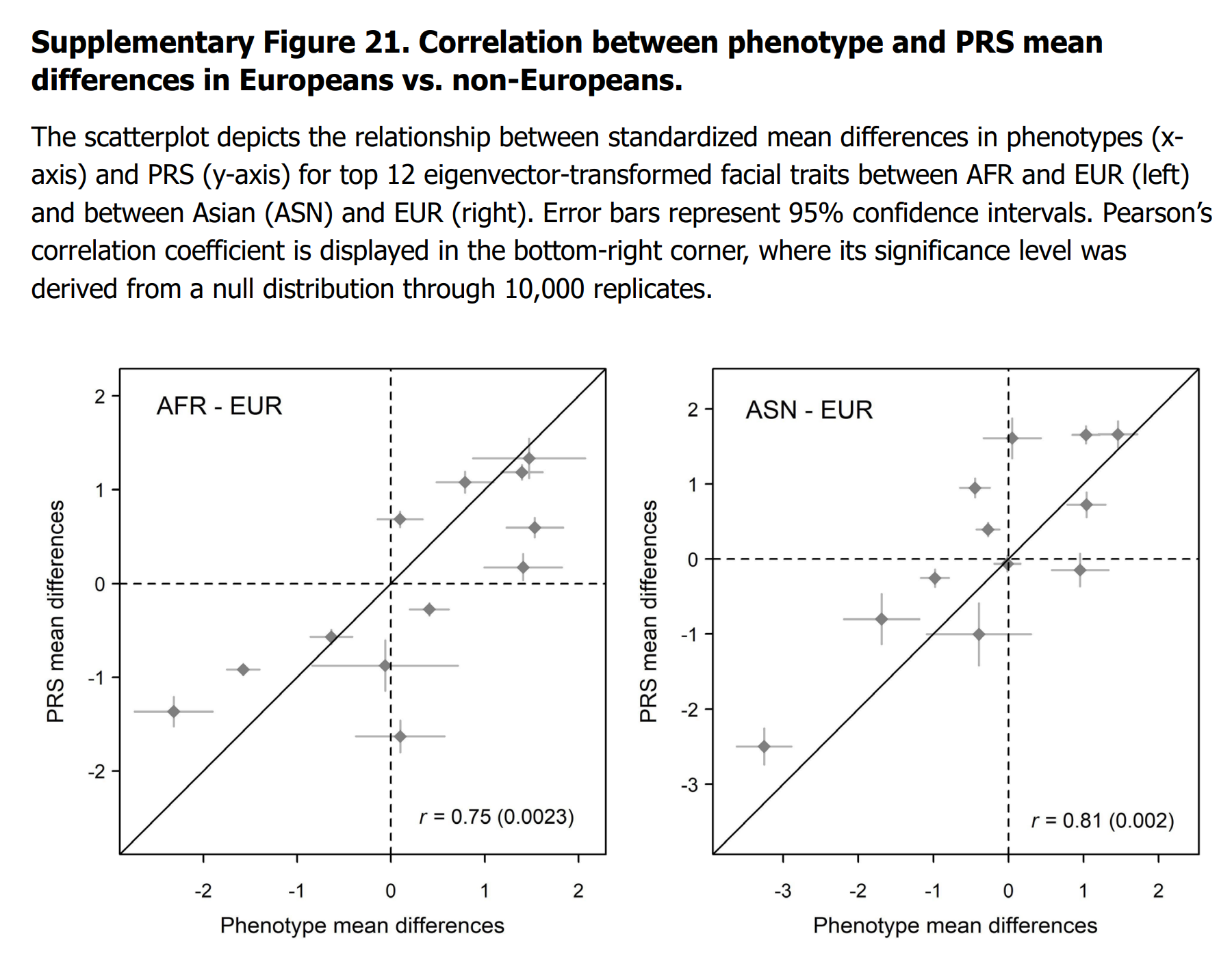 Since many of the 42 traits are highly correlated, we transformed the PRS and phenotype mean differences into an eigenvector space using the same approach described in Methods “Proportion of Facial Variance Genetically Explained”. We retained the top 12 transformed mean differences, corresponding to the accumulated Eigen value over 95% of total 42. We assessed the correlation between the 12 transformed PRS mean differences and the phenotype mean differences. A higher correlation would indicate that the PRS effectively reflects the observed facial differences among populations. To determine the significance of this correlation, we generated a null distribution through 10,000 replicates. In each replicate, we constructed PRS using 382 randomly selected SNPs that were matched for MAF. We transformed mean differences and calculated the correlations for these replicates to establish a null distribution of correlations expected by chance. We compared our observed correlation to the null distribution to calculate a p-value. This allowed us to assess whether the PRS captured population-level facial differences beyond what would be expected randomly. The analysis revealed significant correlations between mean differences in facial traits and mean differences in PRS between EUR and AFR (Pearson’s r = 0.75, p = 0.0023), as well as between EUR and ASN (r = 0.81, p = 0.002) populations (Supplementary Fig. 21).