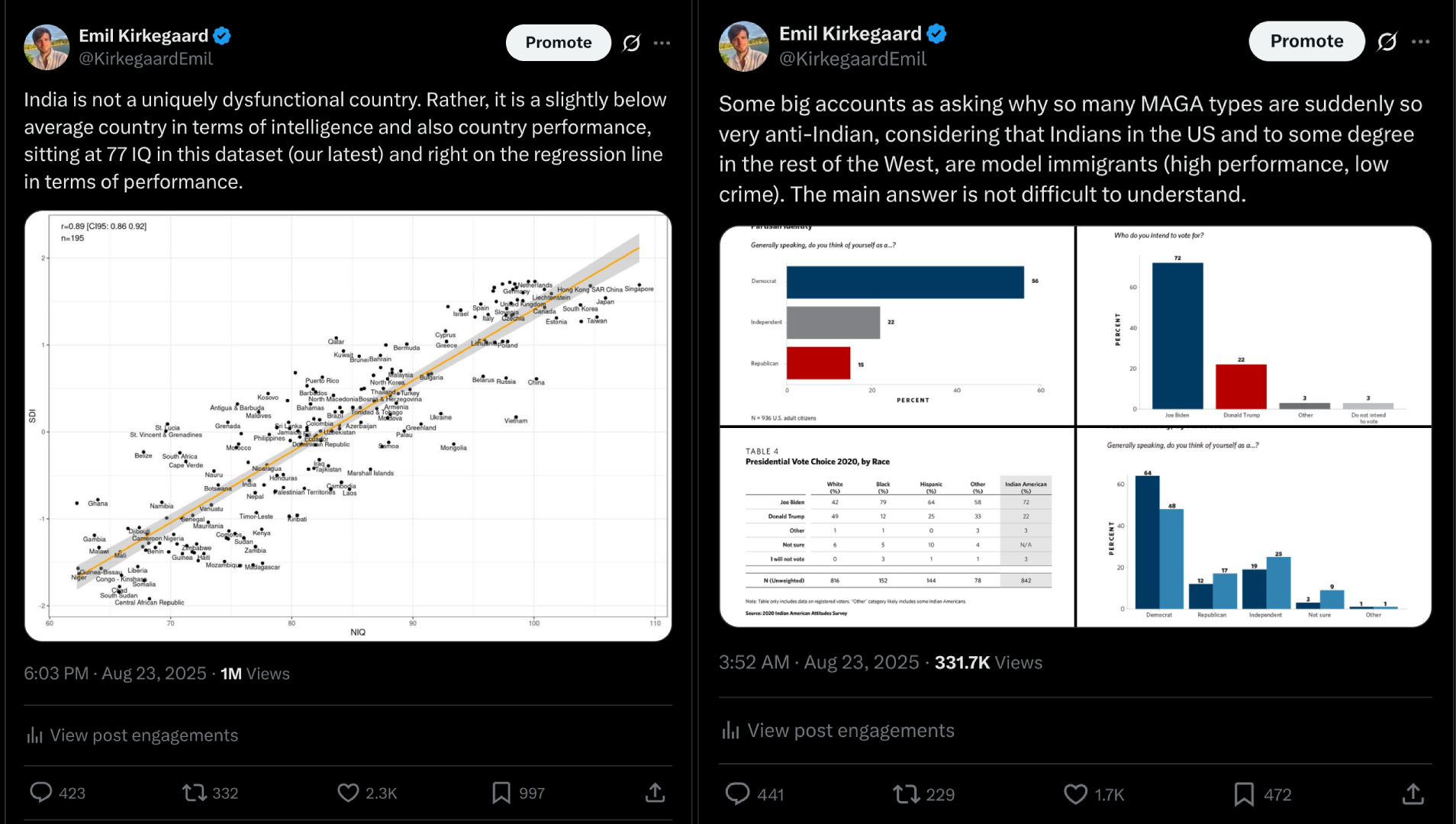 So I guess it made everybody unhappy while being true, which is quite optimal I think. My last post was about explaining why American (and other) right-wingers dislike Indians chiefly because they are a left-wing ethnic group in the West, influential (because elite because elite-selected) and currently the center of attention due to H1B visas and record immigration numbers to Anglo countries. In this post, I will look at estimating the Indian intelligence, that is, addressing (2-3) above.