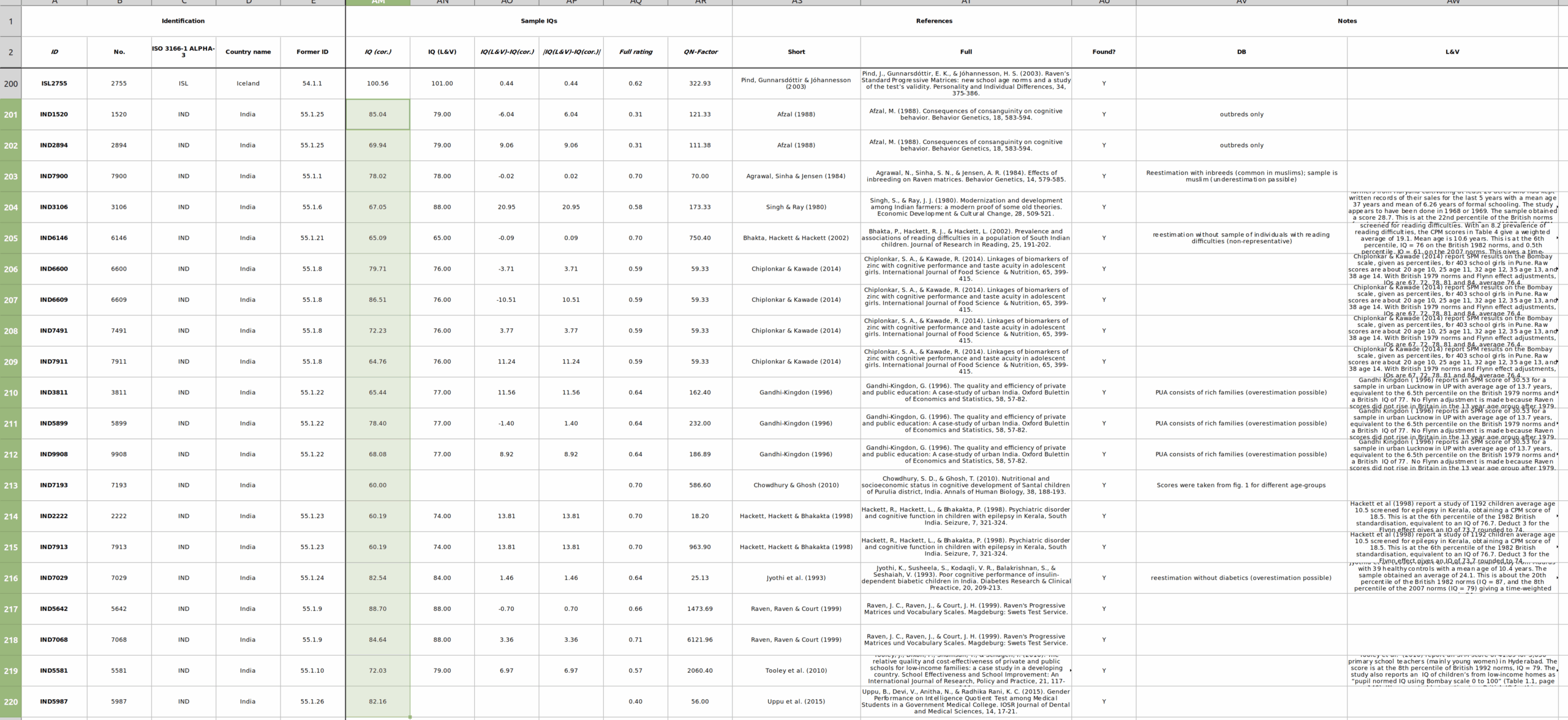 This database is fully transparent, so you can track every study he found and used, as well as the corrections done to them, or subsets of data used. In this case, we see that there are 20 samples given which produce an unweighted mean of 73.5 IQ, and a quality and sample size weighted mean of 76.1 IQ. The samples come from the following 12 studies: