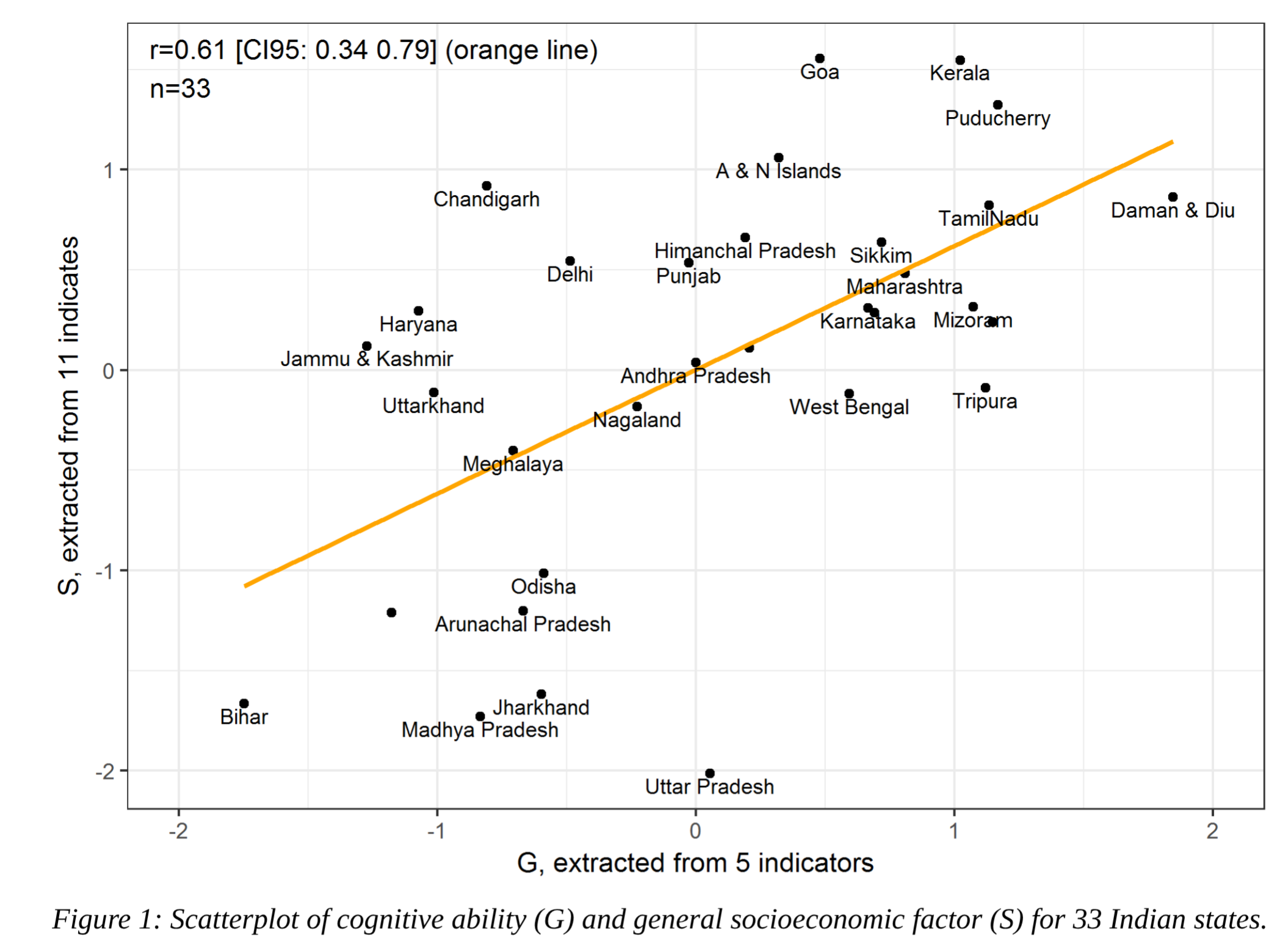In fact, these states were above average, so the sampling bias is at least prima facie against the claims. The HDI scores were 0.692 and 0.715 compared to the Indian average of 0.644 (2022 data). We can confirm this impression by looking at regional testing data from India. Lynn and Yadav published a study on this in 2015, and I reanalyzed their data to produce this plot: