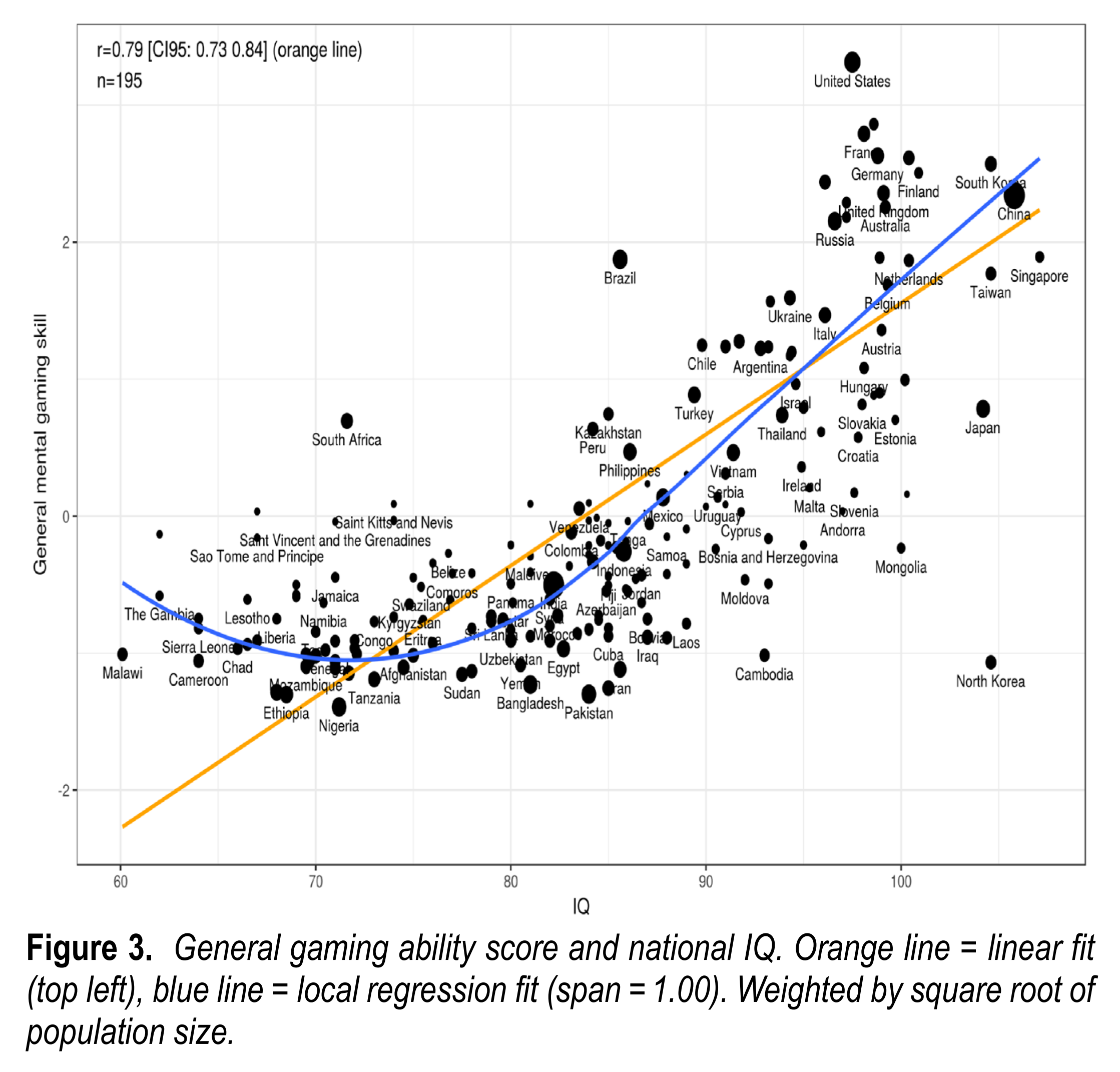 To further convince ourselves the results are sensible, we can look at India’s performance in other intellectual pursuits. I did a study of mental game skill (using counts of top players in many different games including chess), and it produced this plot: