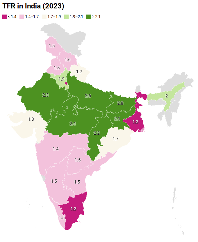 - India reaches sub-replacement fertility at rapid pace. Also shows the same regional dysgenics as every other country I’ve looked at (though again, beware of TFRs as true measures of cohort fertility rates).