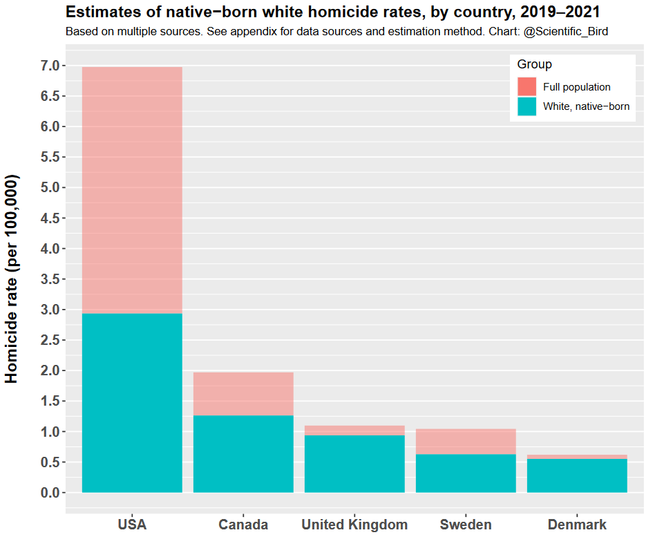 - Semi-relatedly, US homicide rates are still markedly elevated compared to Europe countries even if you only compare the Whites/European ancestry people in both.