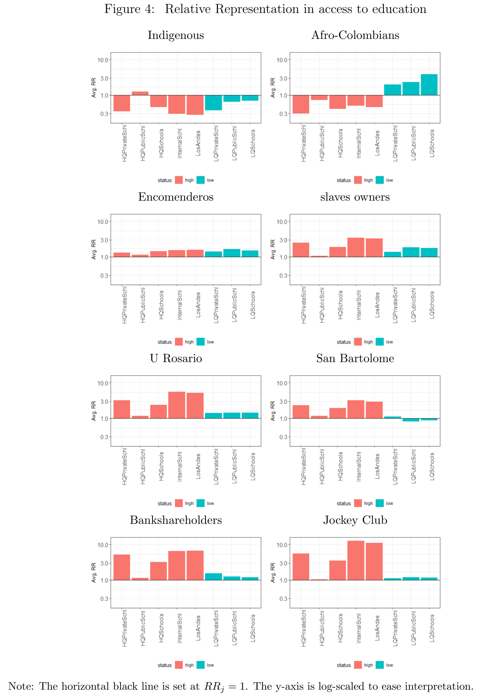 LQ = low quality, HQ = high quality, Los Andes = national top university, international schools = high ranking schools. With this in mind, we can interpret the figures. In the top left, we see that native American (indigenous) surnames are ~0.3 as like to attend the top university, but also mysteriously less likely to attend the low quality schools. My guess is that their children often don’t go to school at all. Otherwise, how do the results make sense? The authors don’t discuss this obvious issue with the results. The African descent population is also less likely to attend the top university, but over-represented in low quality schools. My interpretation is that they live in cities and send their kids to school, but they end up in the worse schools because they perform poorly academically. The various other elites also have kids that are over-represented in high quality schools and to a lesser extent the low quality schools (again, I assume because many children just don’t go to school at all).