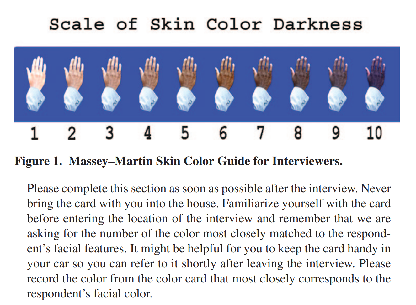 It’s a public access dataset which you can also download from here. We’ve used this a few times. In fact, we already carried out this research idea some years ago when exploring the data, though we didn’t end up using it (aside from Argentina). The surveys were given to people in Spanish, Portuguese and English, depending on country. The surveys are rather long and mostly ask about politics, but they also ask about social status indicators (e.g. ownership of a house, cars, water toilet, computer etc.). On top of this, some of the surveys asked about skin color which the interviewer rated on a rating scale like this one: