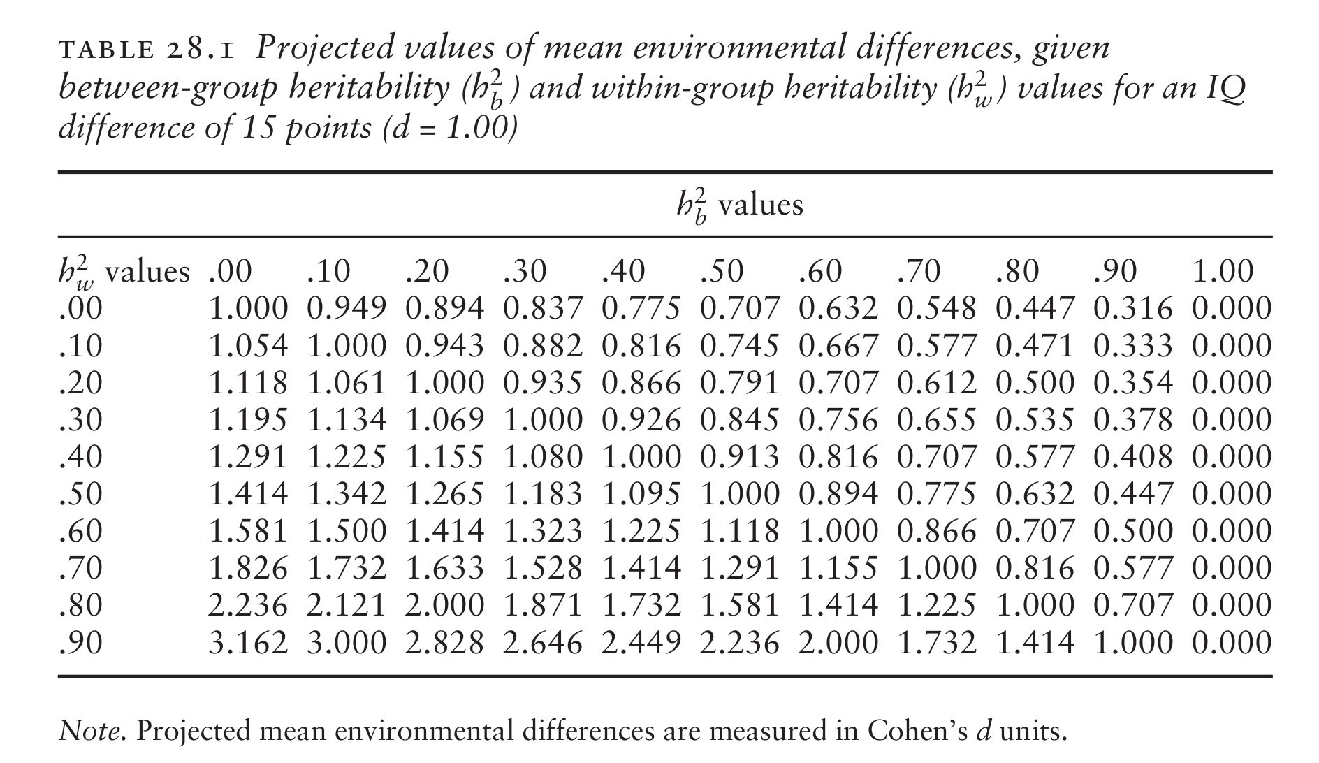 In this case, suppose the gap on some phenotype is 1.00 standard deviation: 15 IQ, or 7 cm in height. Suppose the within group heritability is 90% (like for height), and suppose there is no difference in the height genetic causes (in the true polygenic score for height), then the non-genetic causes must be extremely strong to cause such a large difference. How strong? 3.2 standard deviations in some cause. For intelligence, heritability within group is usually estimated at around 80% for adults, and with a 1.00 d gap, the non-genetic cause would need to differ 2.2 d by the groups. The problem for egalitarians is that social groups never differ in any such cause by over 2 standard deviations. For instance, in the USA, the Black-White gap on a composite measure of social status is around 0.5, or 4+ times too small.