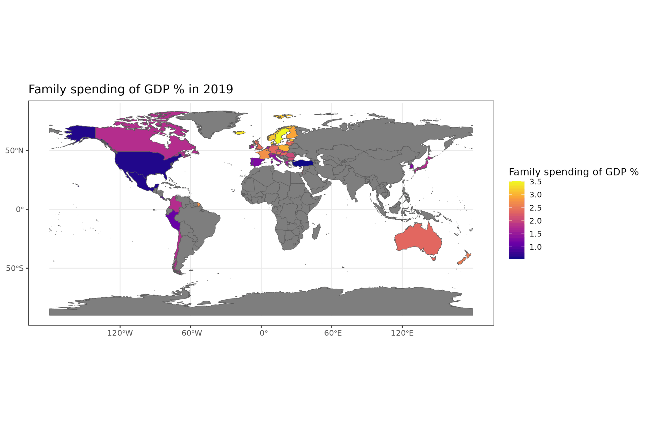 This is specifically government spending: “Public expenditure on family by type of expenditure (cash and in kind) in % GDP”. The point about making it relative to GDP is to control for cost differences. If we used instead raw values (say in USD), then we can argue about how much 1000 USD buys you in USA vs. Poland.