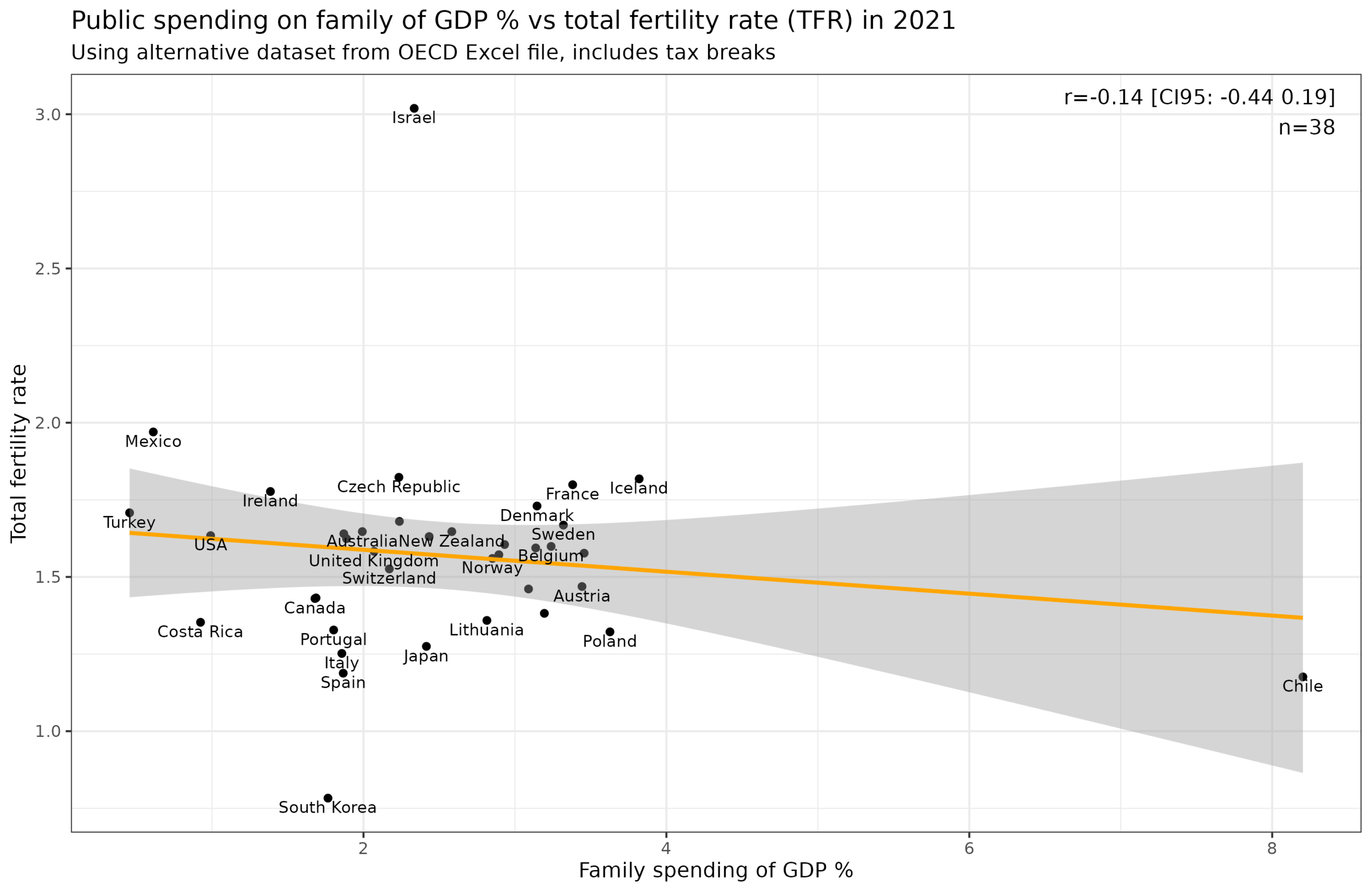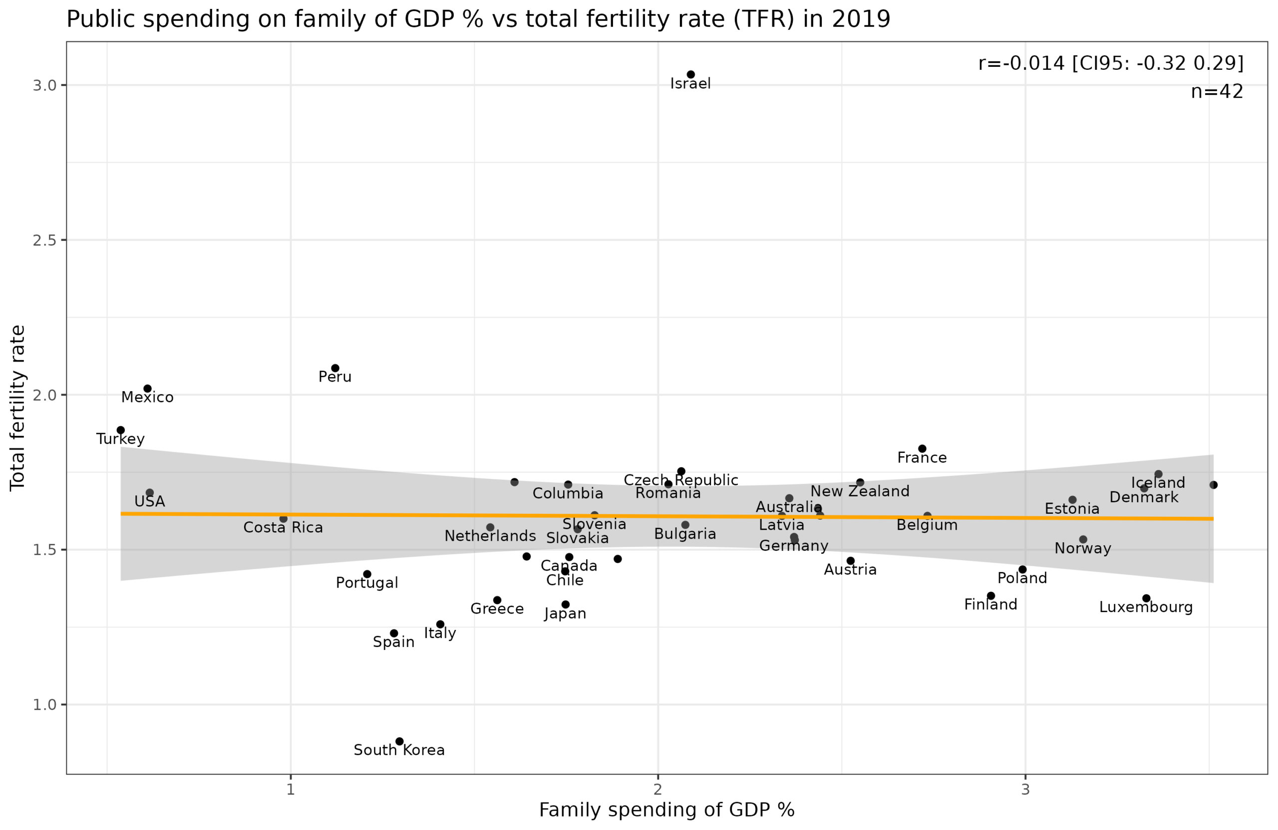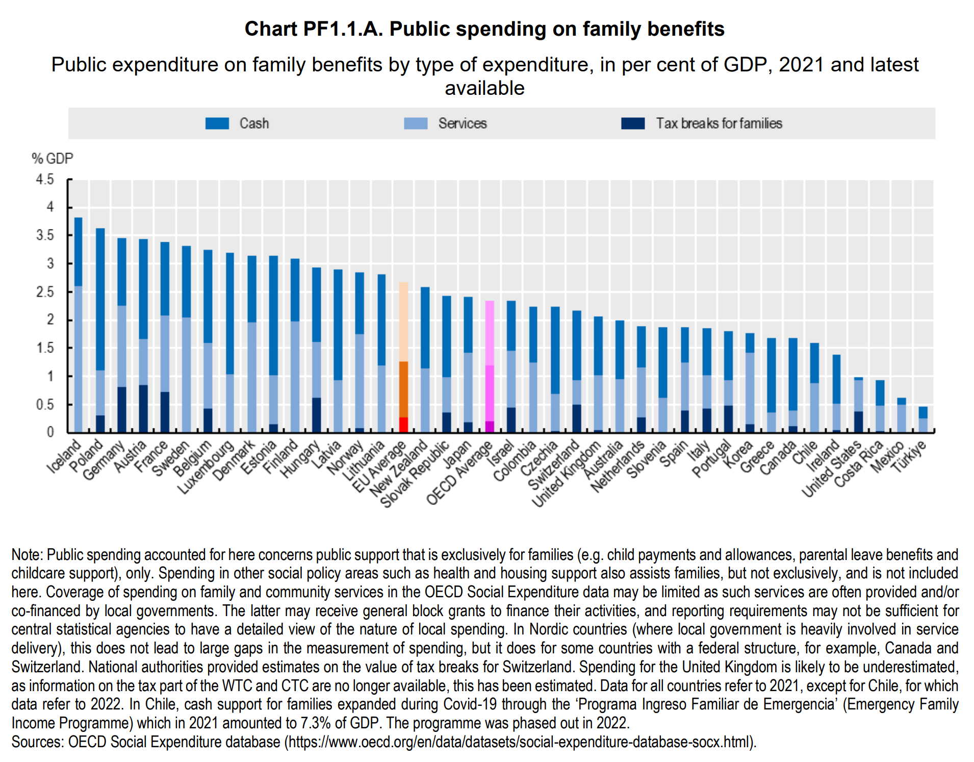 Fertility rates are terrible in every good country except for Israel. Why is that? Well, maybe we just don’t spend enough money on this. Maybe it is too expensive to make a family. If you like economics, your first idea is that to get more of something, you should remove regulations, and your second idea is to subsidize it. Fortunately, countries differ in how much they do this. OECD provides data on this for OECD+ countries: