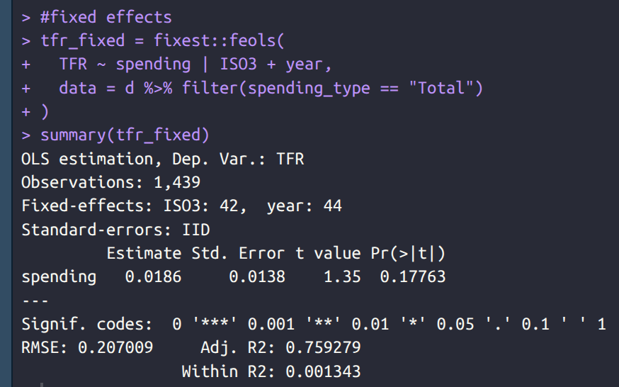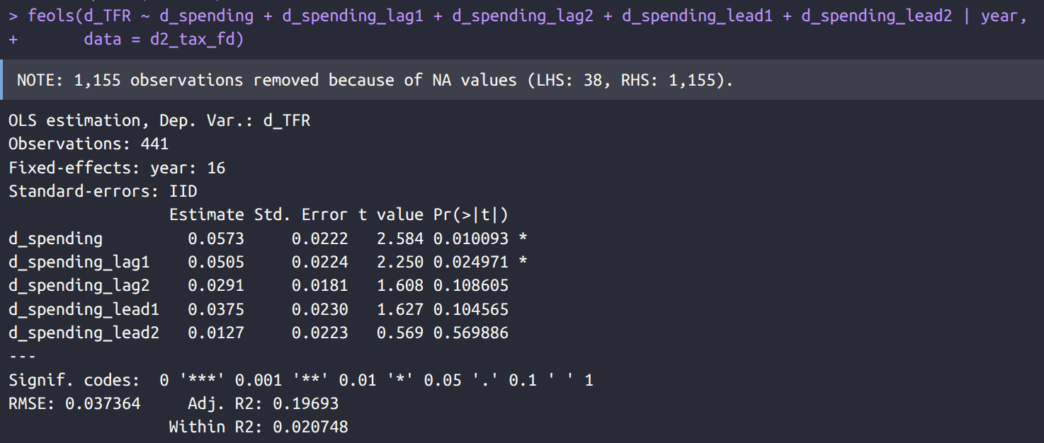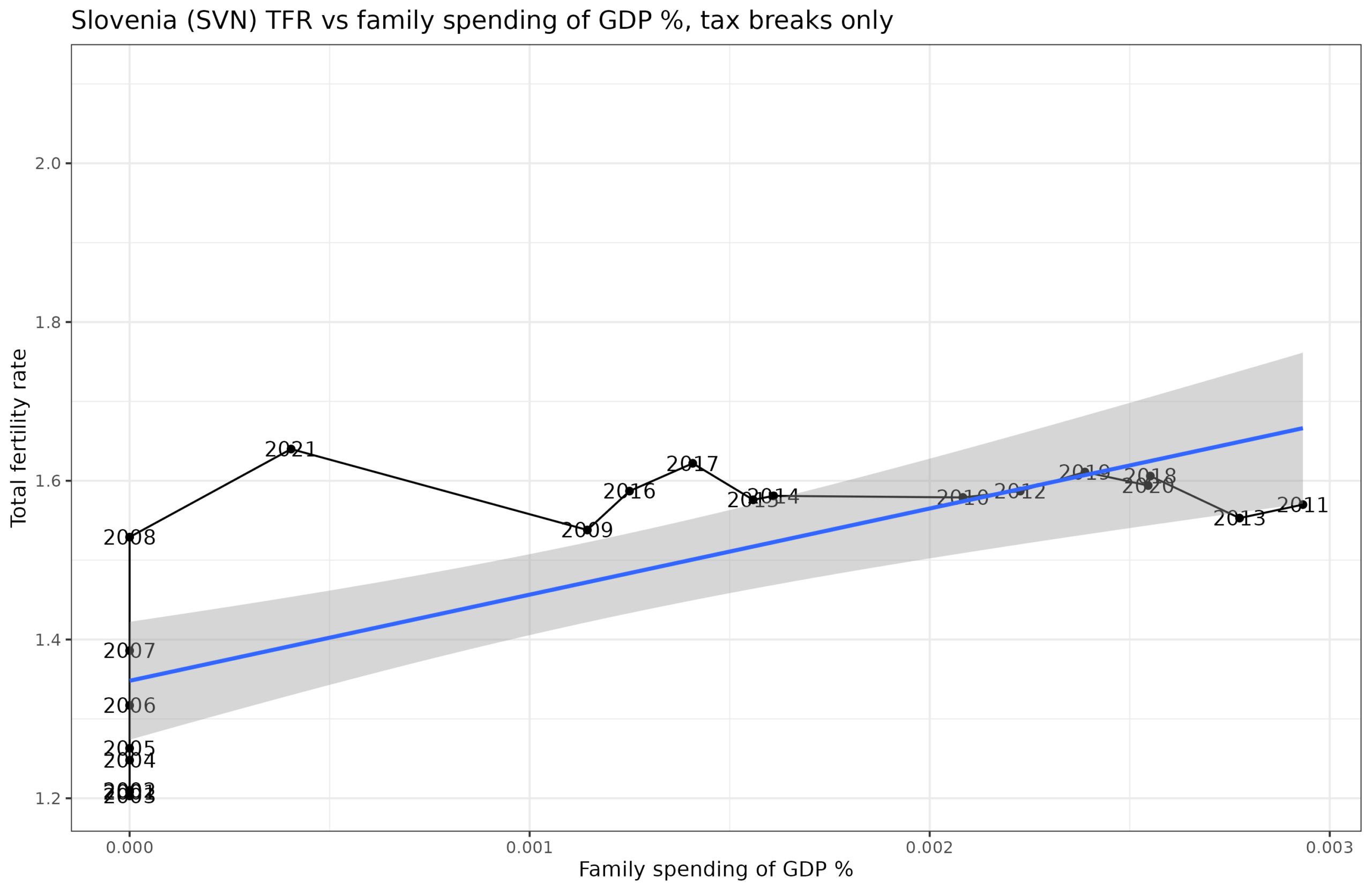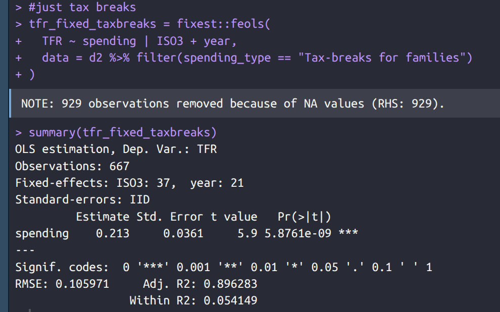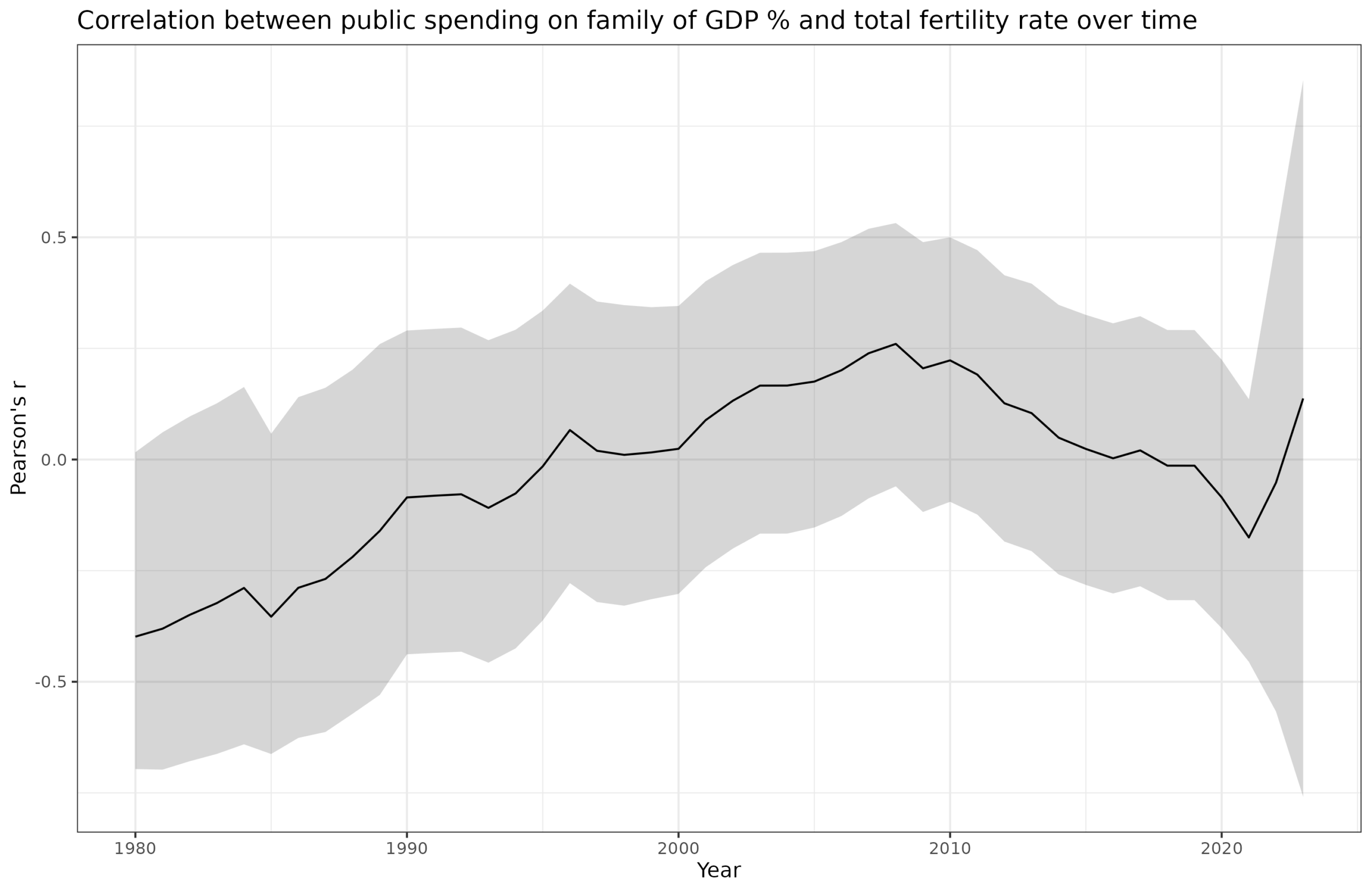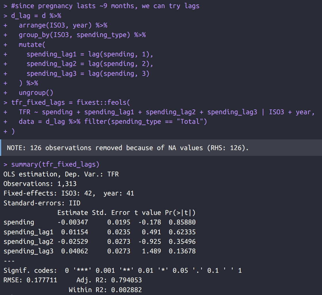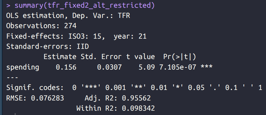 OK, but maybe it takes a while for the policies to have an effect. After all, a pregnancy takes 9 months at least, and it may take a while to decide to try this and get it working. So we can try lagging the values (use previous year’s spending to present current year’s TFR):
