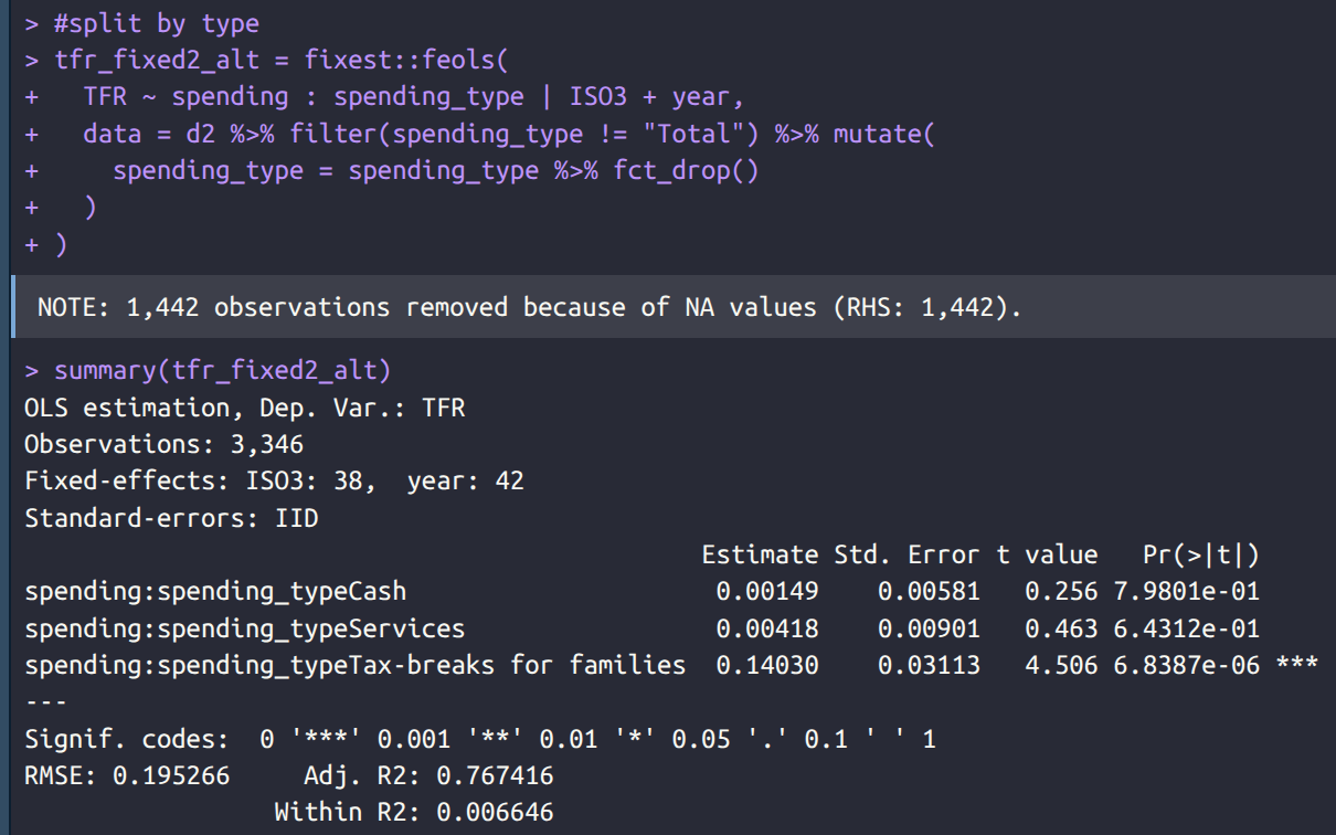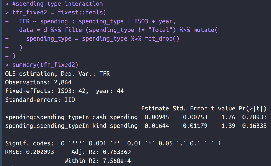 OK, but maybe it is the spending type that matters? Can we find p < 5% anywhere if we try every model variant? OECD breaks down the spending into “In kind spending” (govt gives you stuff, like free childcare) vs. “In cash spending” (govt gives you money, like maternal paid leave). Most of the spending in “in kind” but it doesn’t matter anyway: