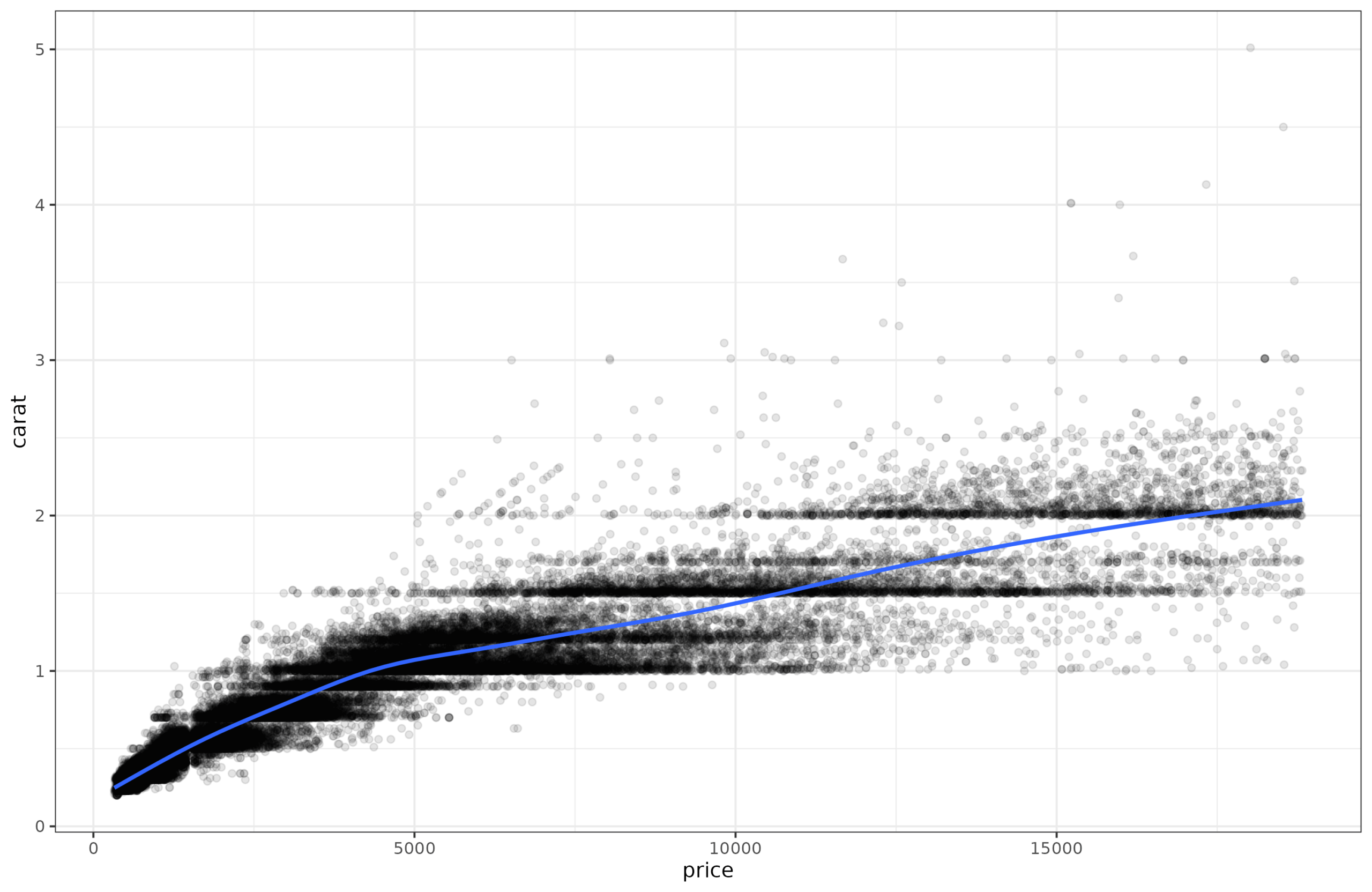Let’s go over some example data. For reasons known only to yourself, imagine that you are looking at carats of diamonds as a function of their price. This isn’t really a psychological scale, but that doesn’t matter for the math. (In fact, since carat is a mass (200mg), I have inadvertently managed to make a scale pun!) If you plot the relationship it looks like this: