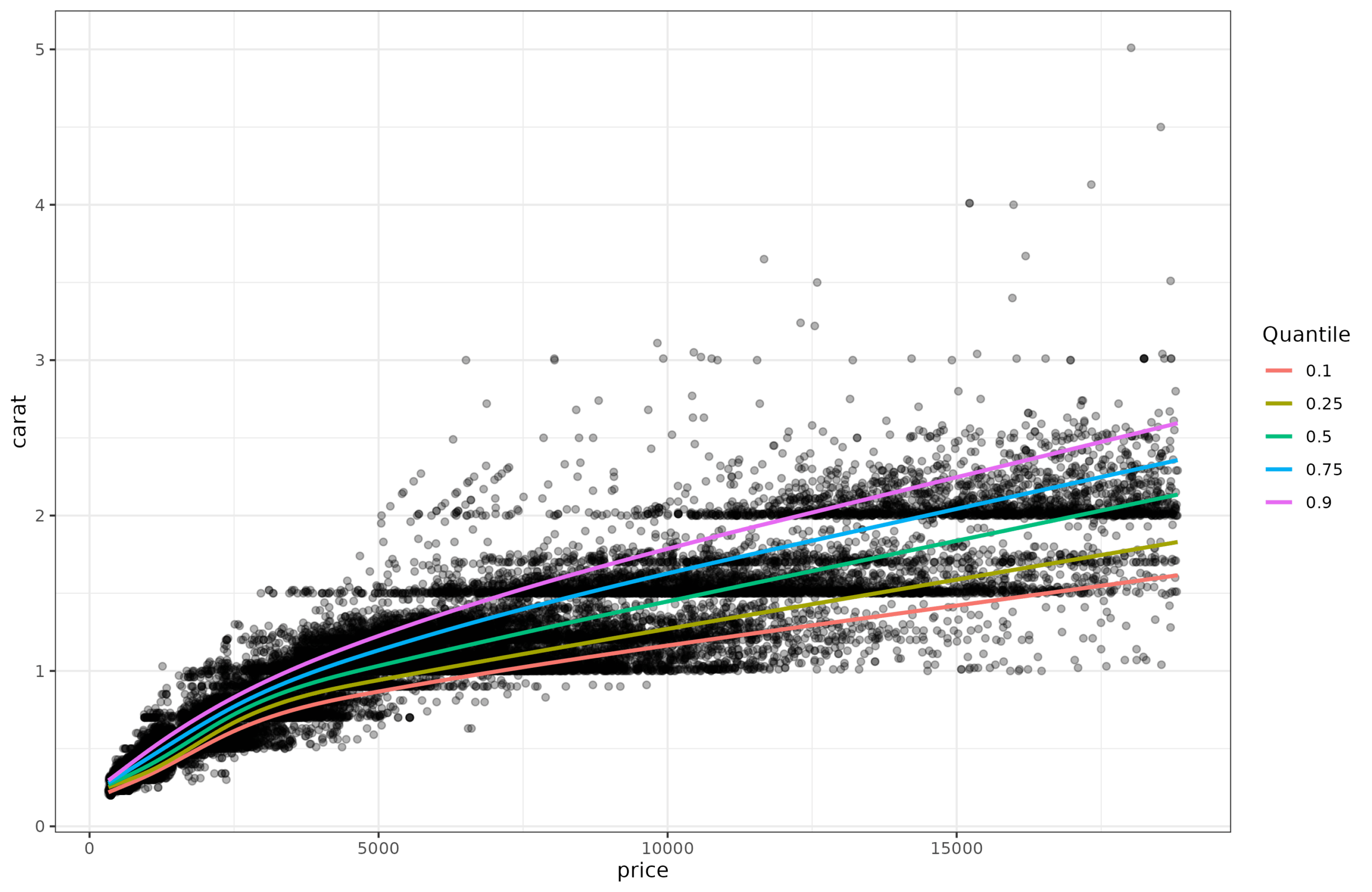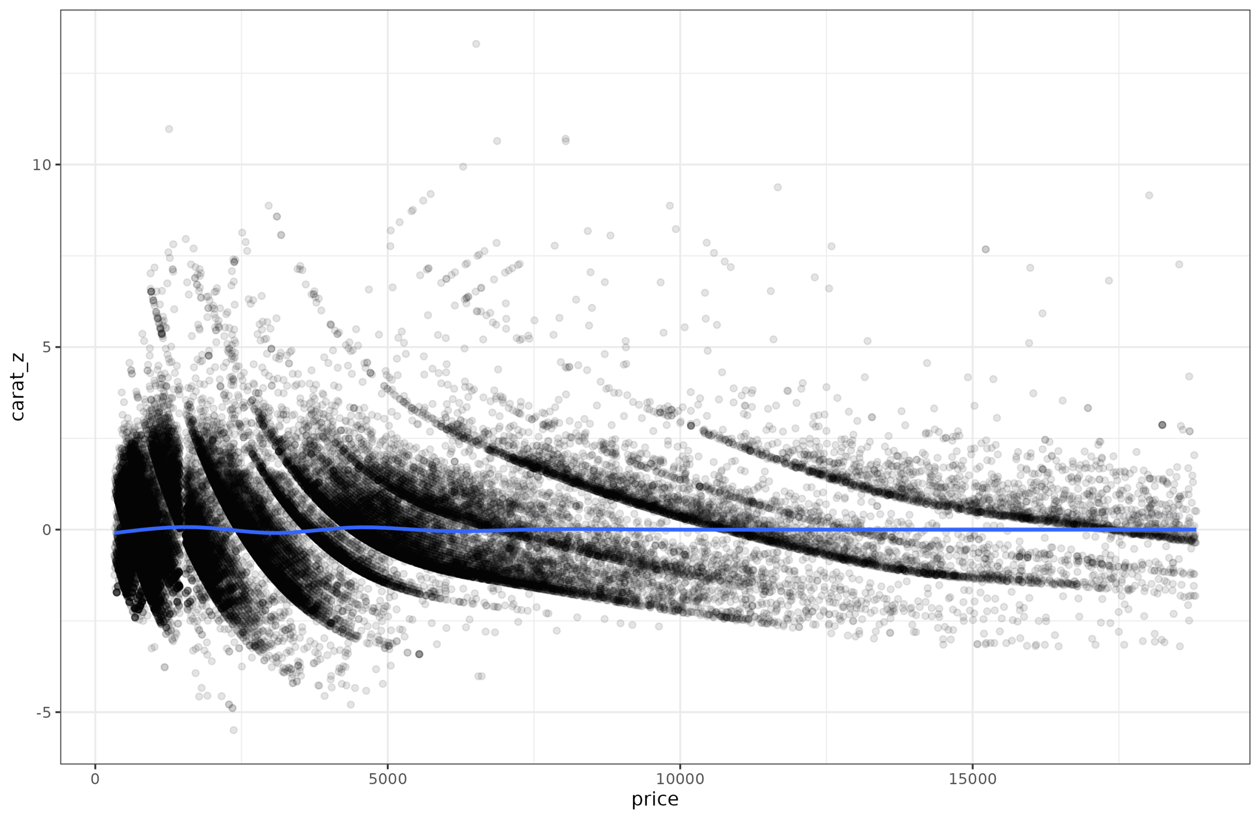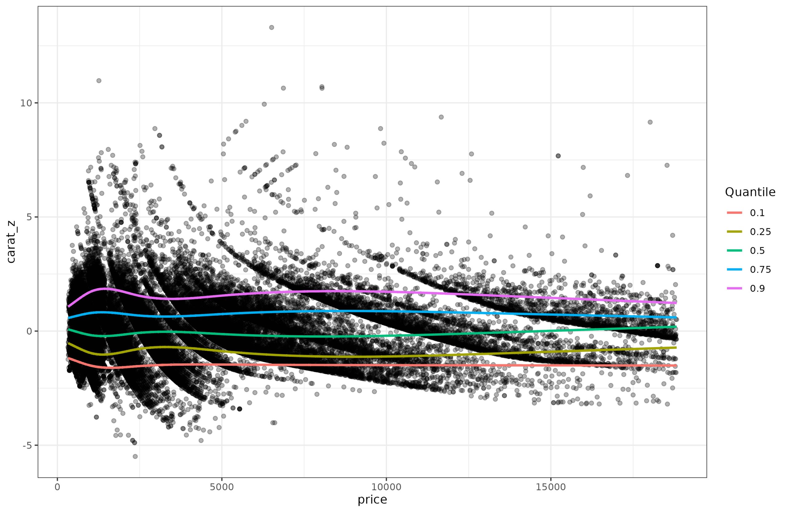 The modeling approach here is, however, the reverse of what one typically wants to do. Here, we spent a while figuring out how to completely remove the effect of price on carat so that we can make the distribution around the mean have constant variance, which thus allows one to interpret values easily as comparable z-scores. In real life, one usually begins with a particular score and age (say carat 1.00 and price of 6910 USD) and asks whether this is a good or bad size diamond for this price. Plugging these two values into the models we just went through results in a value of -1.112 z, in other words, 13.3rd centile. It is relatively light diamond for the price. If you go back to the second plot (the one with quantiles and original variables), and eye-ball the location of price=6910, carat=10, you can see it is close to the red line, which shows the 10th centile.