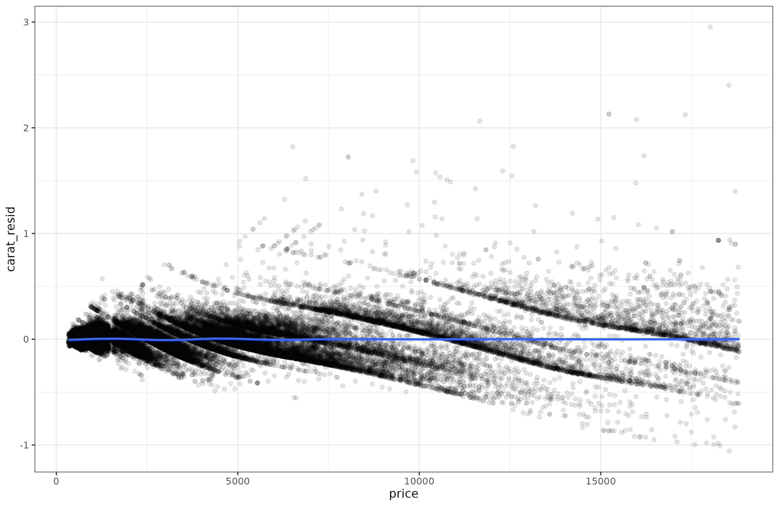 And here we can easily see that the lines get further apart as the price goes up. This non-constant dispersion is called heteroscedasticity (a very annoying word to say, try it a few times). There are some standard statistical tests for testing for this. I tried them out but found they were brittle, so I implemented my own variants. It’s easy to show how it works. First, you fit regular (means) regression to the data (carat~price), and save the residuals. Since the pattern is a bit nonlinear, I fit a spline (gam) model. It obtained adj. R2=90%, which is equivalent to r = 0.95, and thus as expected slightly better than the linear model (r = 0.92). Anyway, we save the residuals and plot them: