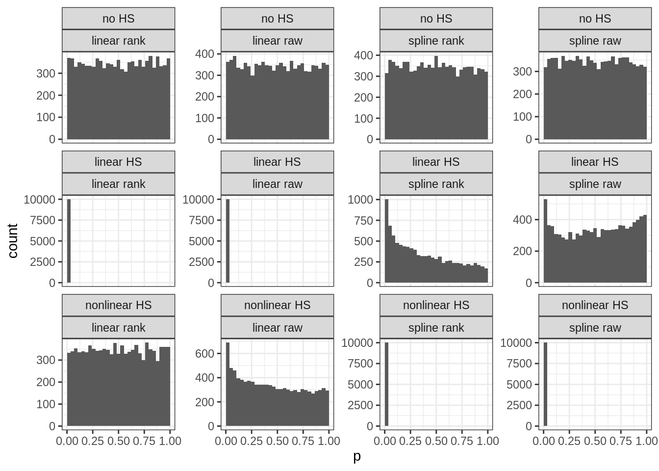 The rows are: No/linear/nonlinear heteroscedasticity in the simulated data. Columns are: 4 methods variants to detect heteroscedasticity. Each subplot shows the p-values from many replications of simulated data. This distribution should be uniform when there is no signal as in plots in the top row (a uniform distribution implies that the chance of finding a p-value below 5% is in fact 5% and not higher or lower). The distribution should be moved towards the left when there is signal (statistical power), with clear examples in row 2, column 1-2, and row 3, column 3-4 (power ~100% with these sample sizes). However, the model comparison fails a bit so that spline tests sometimes detect false nonlinearity (row 2, columns 3-4).