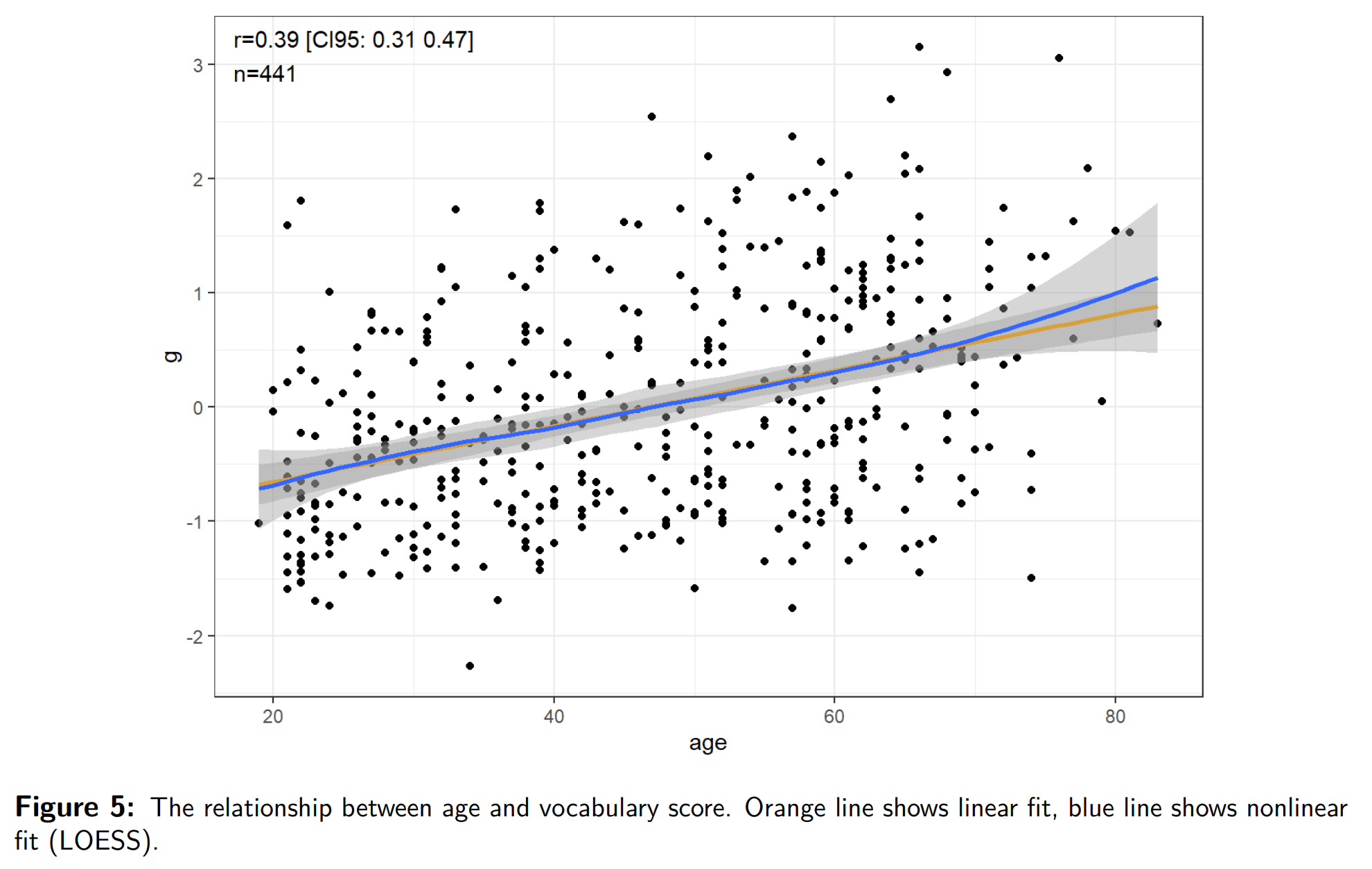 Anyway, I used the diamonds example because the dataset is cool and has a lot of data. Here’s a realistic example from one of our studies (A New, Open Source English Vocabulary Test). The scored vocabulary test (226 items) and age have this relationship: