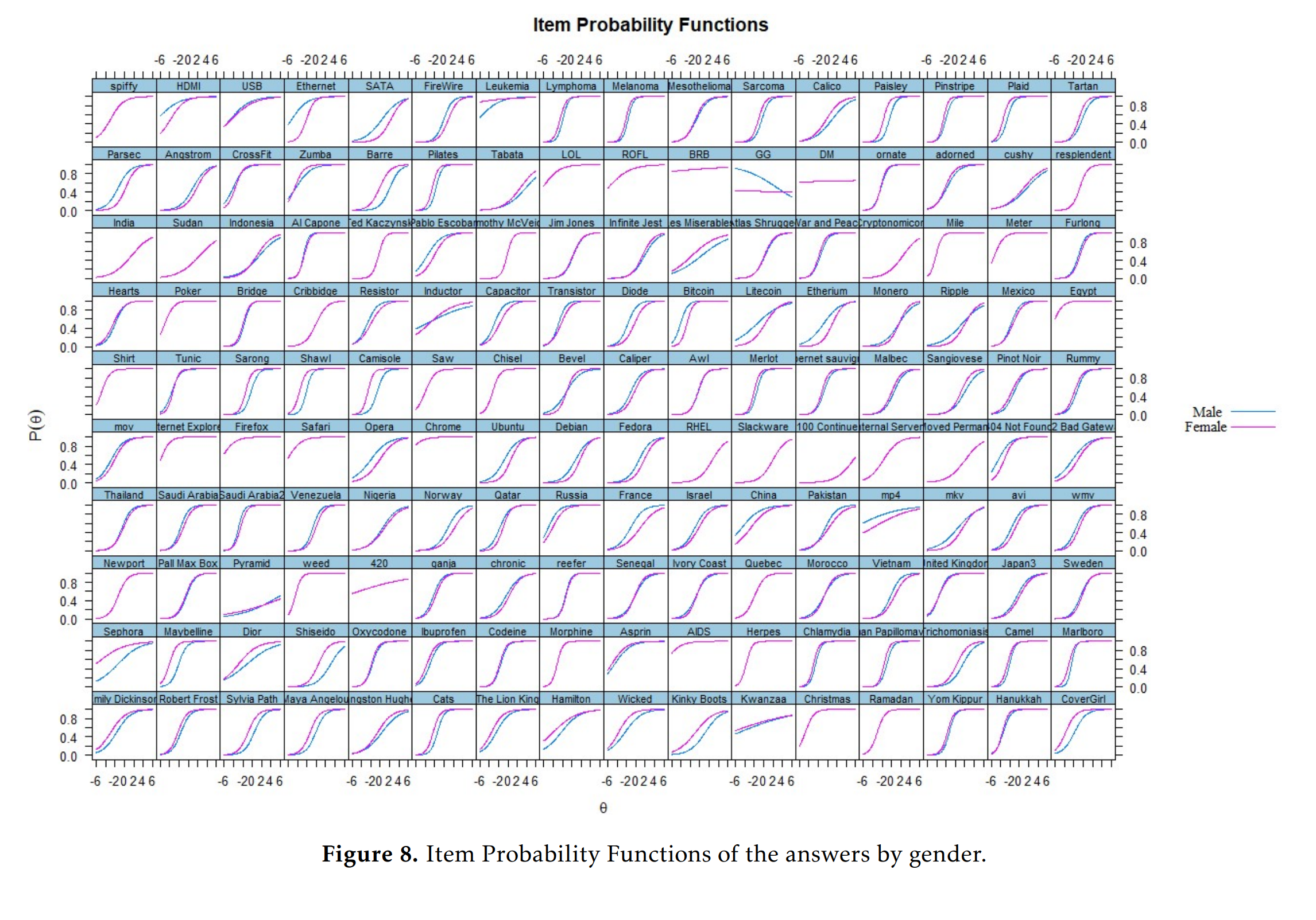 The data is modeled as every item measuring general knowledge and nothing else (1 factor model). Since clearly knowledge is not 1-dimensional, this will get every item flagged for bias insofar as it relates to some specific domain of knowledge on which the sexes differ in interest. Thus, any item with such a sex difference in interest will be flagged and the lines will diverge. If you look for the kinds of items that favor women (purple line above the teal), you see that these usually concern clothing (e.g. Sephora, make-up brands question), or literature (various authors, women read more fiction). Items favoring men concern technical matters such as computers (e.g. Bitcoin), physics (e.g. parsec). A more sensible approach, then, is to compute sex differences by domain of knowledge, as previous studies have done: