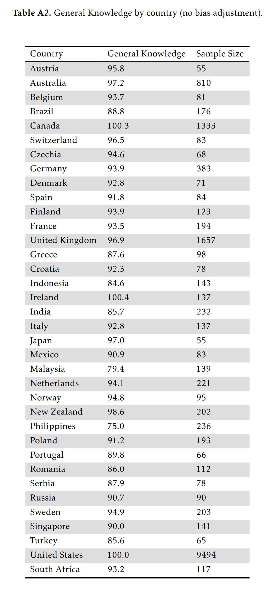 In addition to the culture and language bias, note that all these self-selected samples in online tests have varying degrees of selection bias. South Africa obtained an IQ of 93, higher than Poland. This is not credible and presumably suggests that some small number of English speaking South Africaners were the ones in the sample, while the Poles were not good at English. We have made some efforts to see if a truly unbiased knowledge test could be made for online testing purposes, and maybe more fine-grained analysis of this dataset could suggest some ideas in this regards. So far we have not been very successful. Asking questions for a general knowledge test that only involves culturally universal topics is difficult, and mostly results in questions about astronomy and physics. Even these are debatable due to differences in science curriculums in schools.