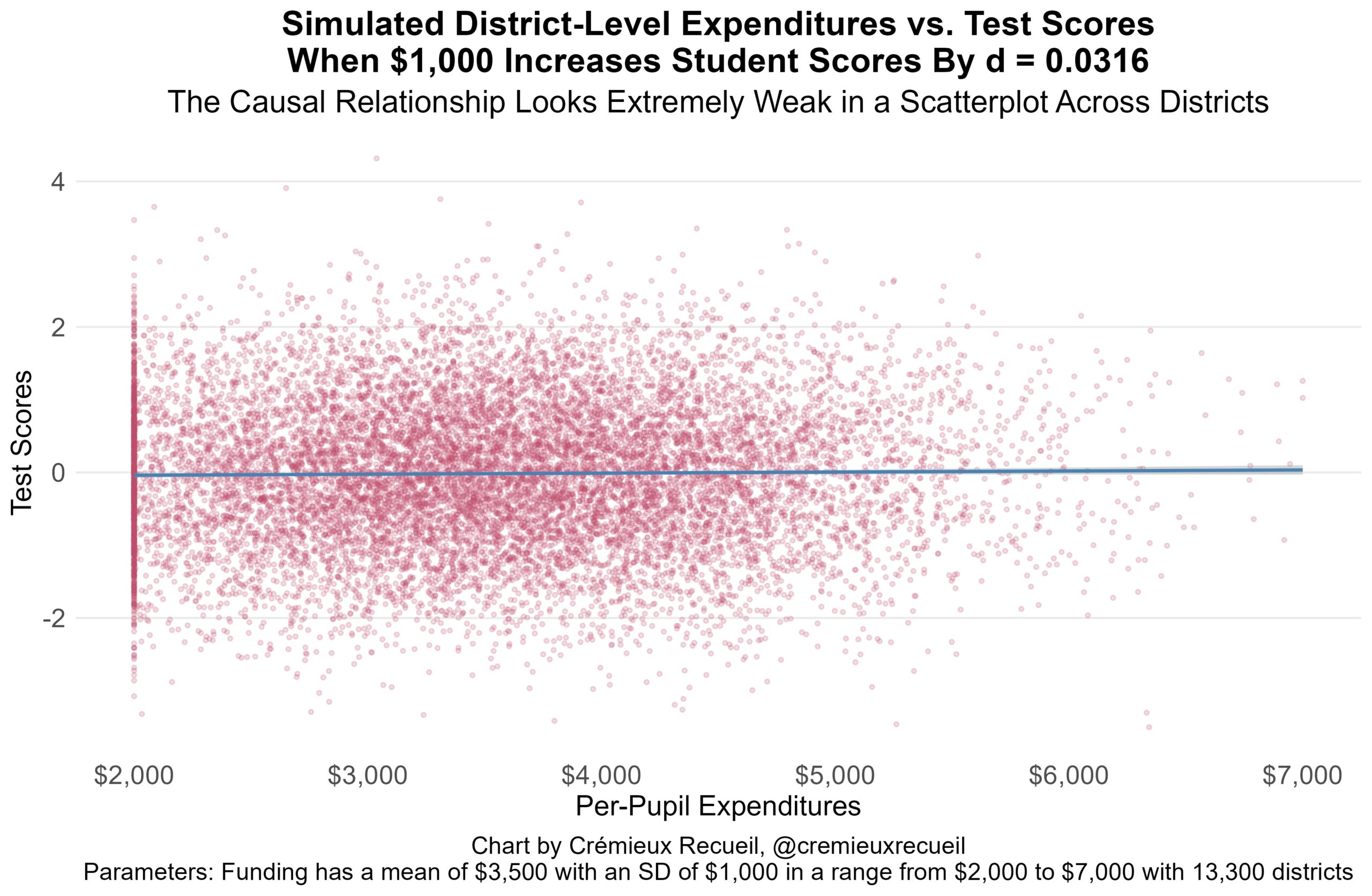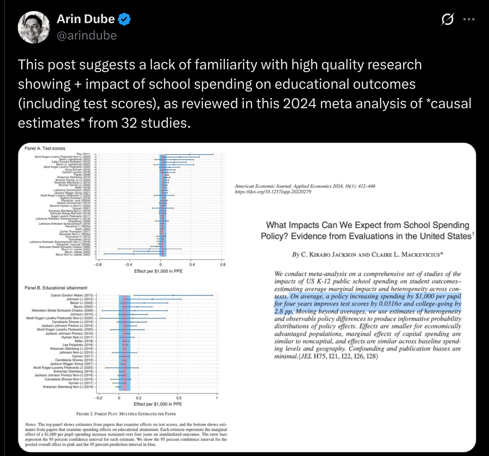 - Various complex economist studies of semi-random variation in education funding finds relatively minor benefits if you stare really hard at the data, e.g., 0.03 d per 1000$/pupil. They make big promises about how great a mere 25% funding increase would be.