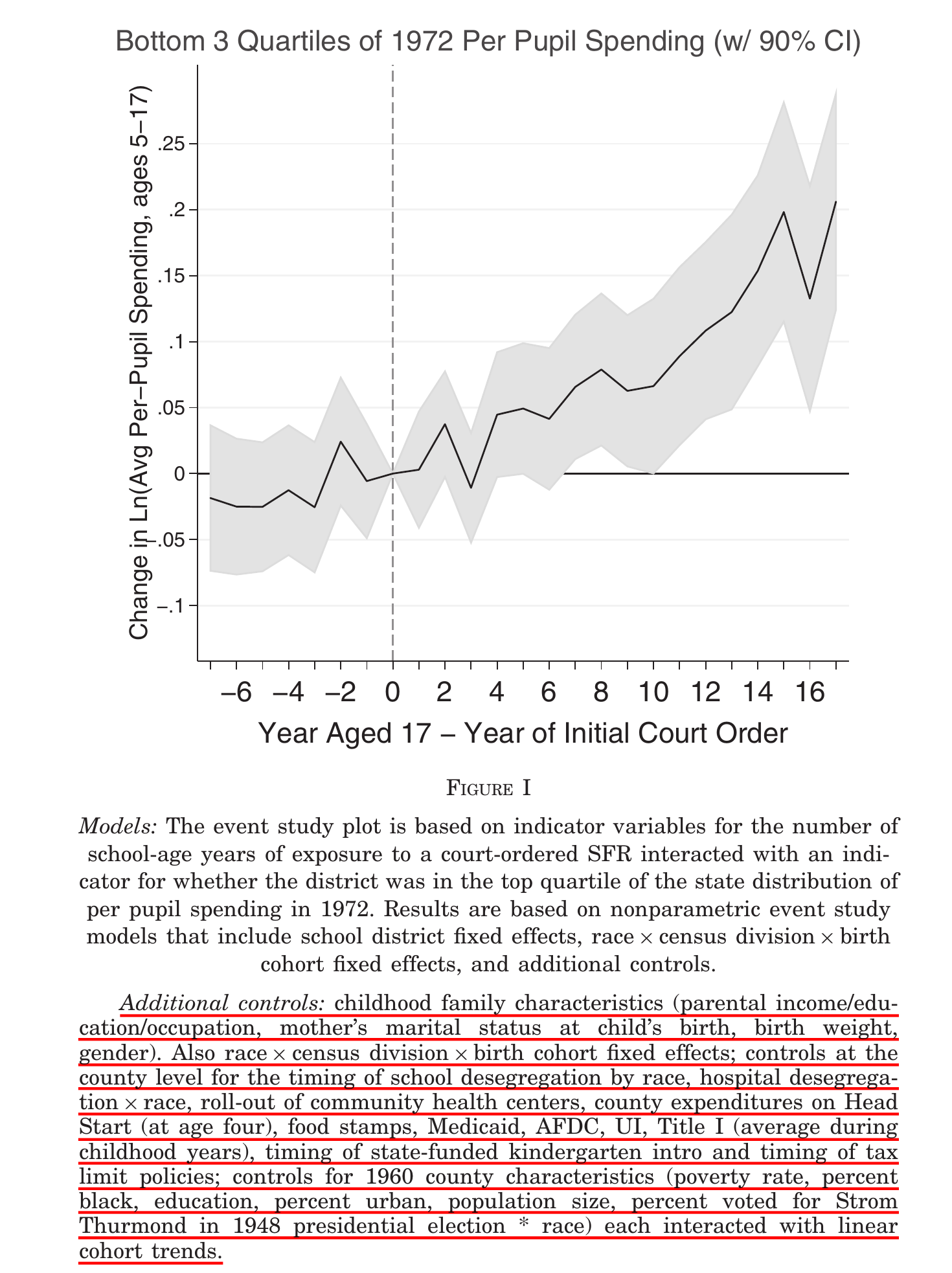 This figure is just one of their checks that funding actually went up in the bottom 75% of schools funding-wise. However, note their list of control variables. It’s a crazy list. As far as I can tell, they don’t present results without such an extreme list of controls. And probably no one is going to reanalyze these particular data to see if other sets of controls would change the results, so no one knows, except maybe the authors. The highlights my first general complaint: the study is extremely complicated and any number of things could have gone wrong, and there is no way for the reader to tell. We already know from prior research that when many teams of researchers are told to analyze the same dataset for the same outcome, they come to wildly different conclusions. As I wrote on X regarding general philosophy of science: