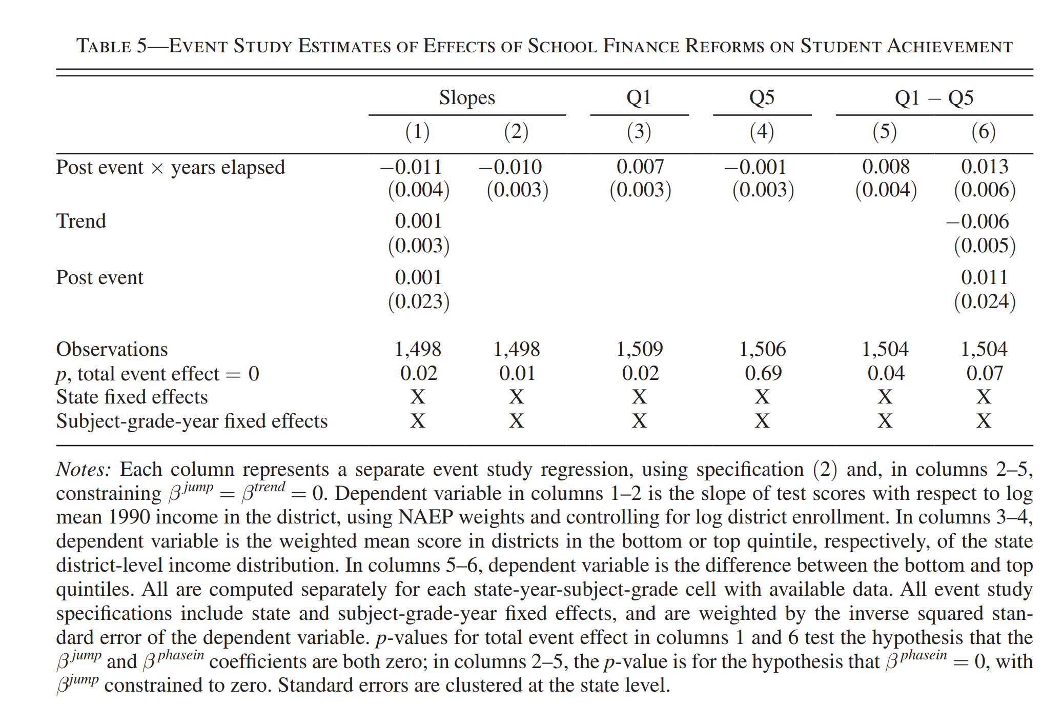 Moving on, another study I was sent is Lafortune et al 2018, who is one of the studies concerning achievement scores and finance reforms. If you look back at the meta-analysis figure above, you can see this study produce essentially a bunch of 0 findings. Their main table is this: