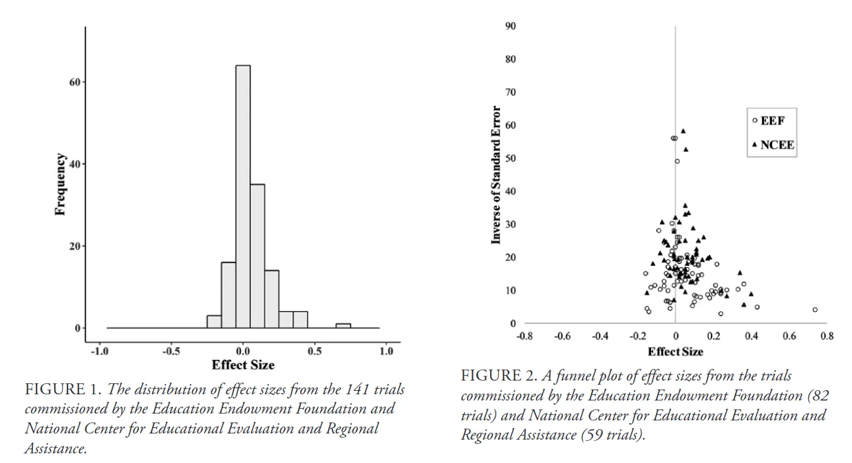 In this case, we are dealing with the Stainless Steel law. Ask yourself, what would you trust more? 1) A large randomized controlled trial, or 2) some economists who did complex methods you don’t understand on semi-random data? Of course the randomized trials are to be preferred because they are harder to screw up. As a matter of fact, here is the distribution of large randomized trials of educational interventions that were tested by 3rd parties with planned analyses: