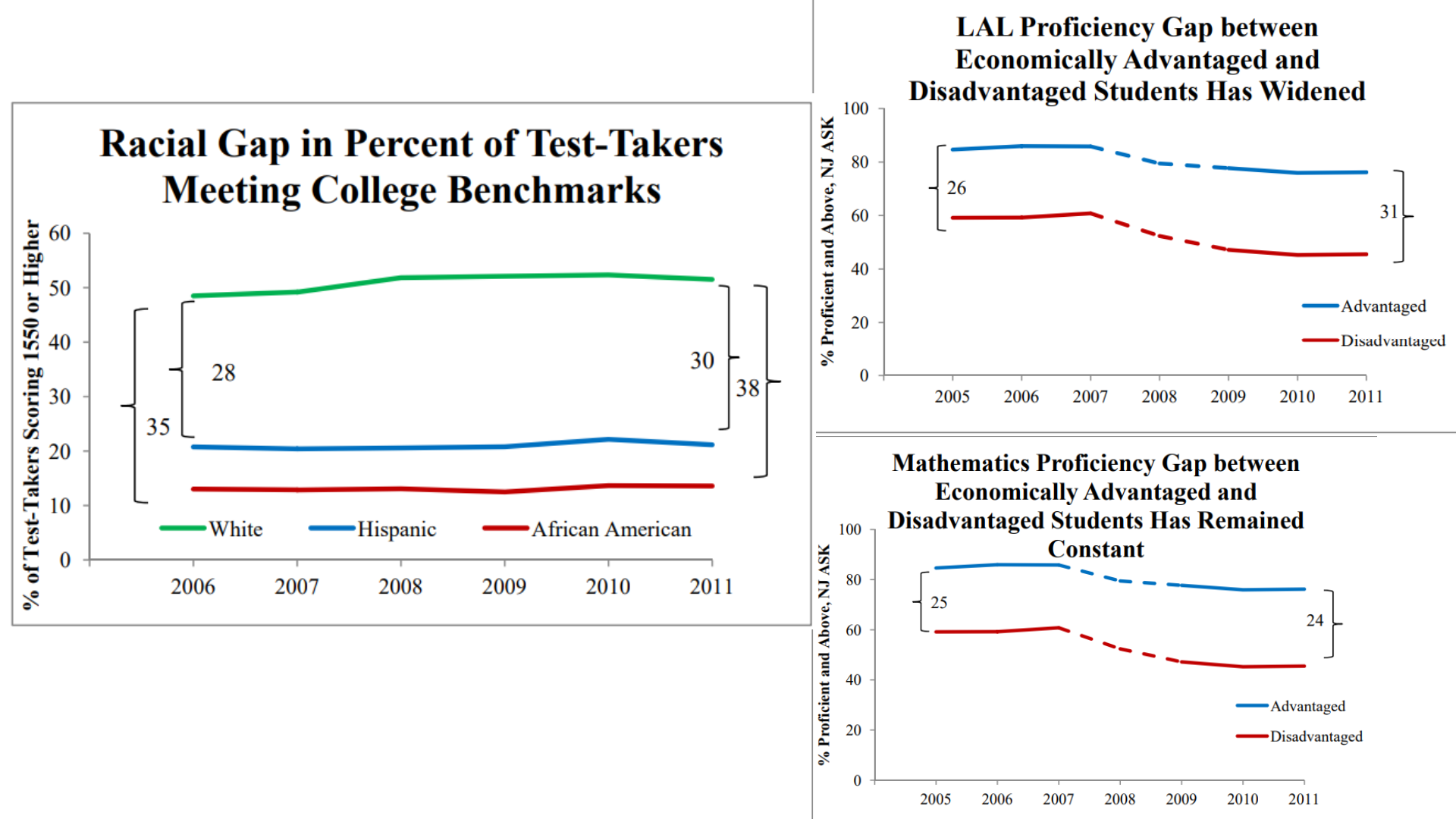 Needless to say, this judicially-mandated colossal increase in funding for these districts (spending nearly tripled in real terms, from $7000 to $18,850/student in 2010 dollars 1973-2010), paid for by other NJ taxpayers, did not close the achievement gap in the slightest (3/7).