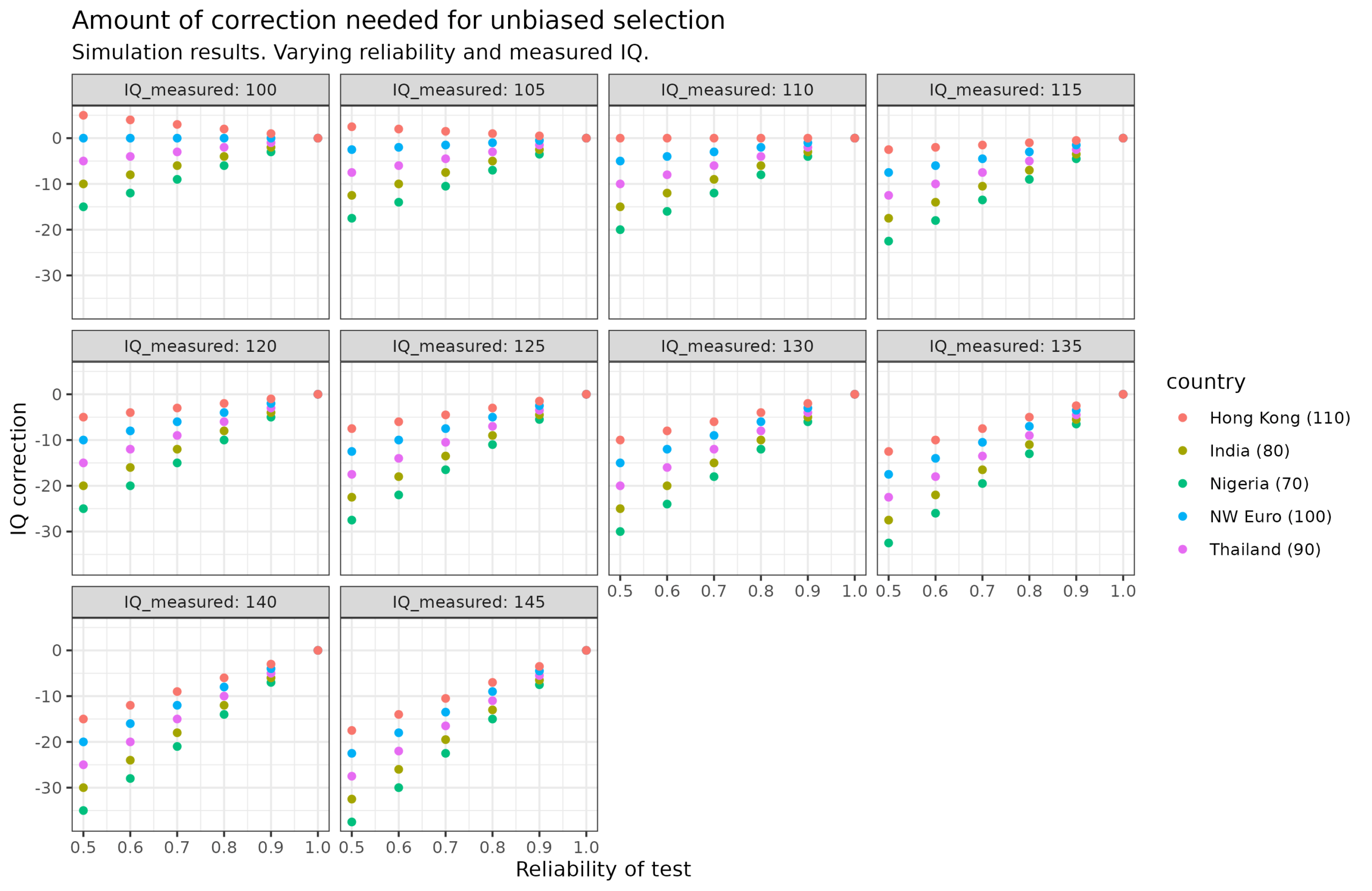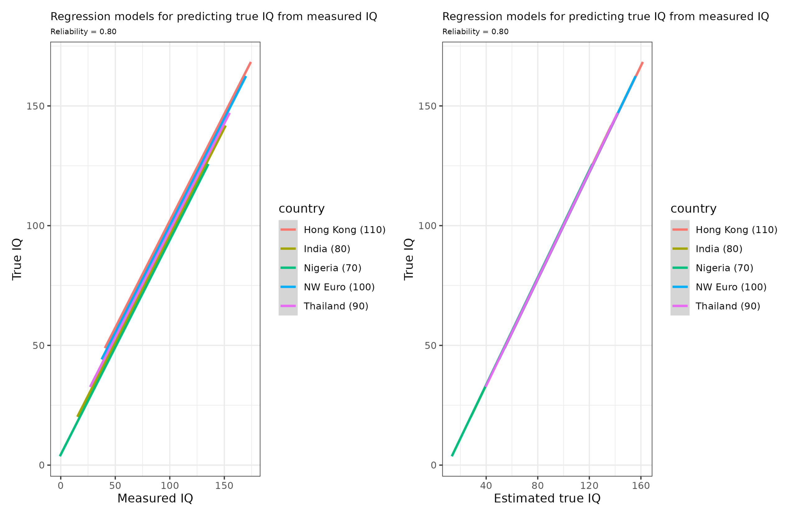 The somewhat complex plot shows us which value we have to add from the measured IQ to adjust for the unreliability and differences in group IQs. In other words, the amount of regression towards the mean to apply. Thus, we see that if the group IQ mean is actually above the measured value, we must add a bit: top left plot for Hong Kong, if we have reliability = 0.5 (poor), and see 100 IQ, we should add 5 to get a best estimate of 105 IQ. In the case of extreme cases where we see 145 IQ with a standard 0.80 reliability test, we need to subtract 7 IQ if the person is from Hong Kong but 15 IQ if they are from Nigeria. Doing so in both cases will result in unbiased estimates of these bright people of 130 and 138 IQ.