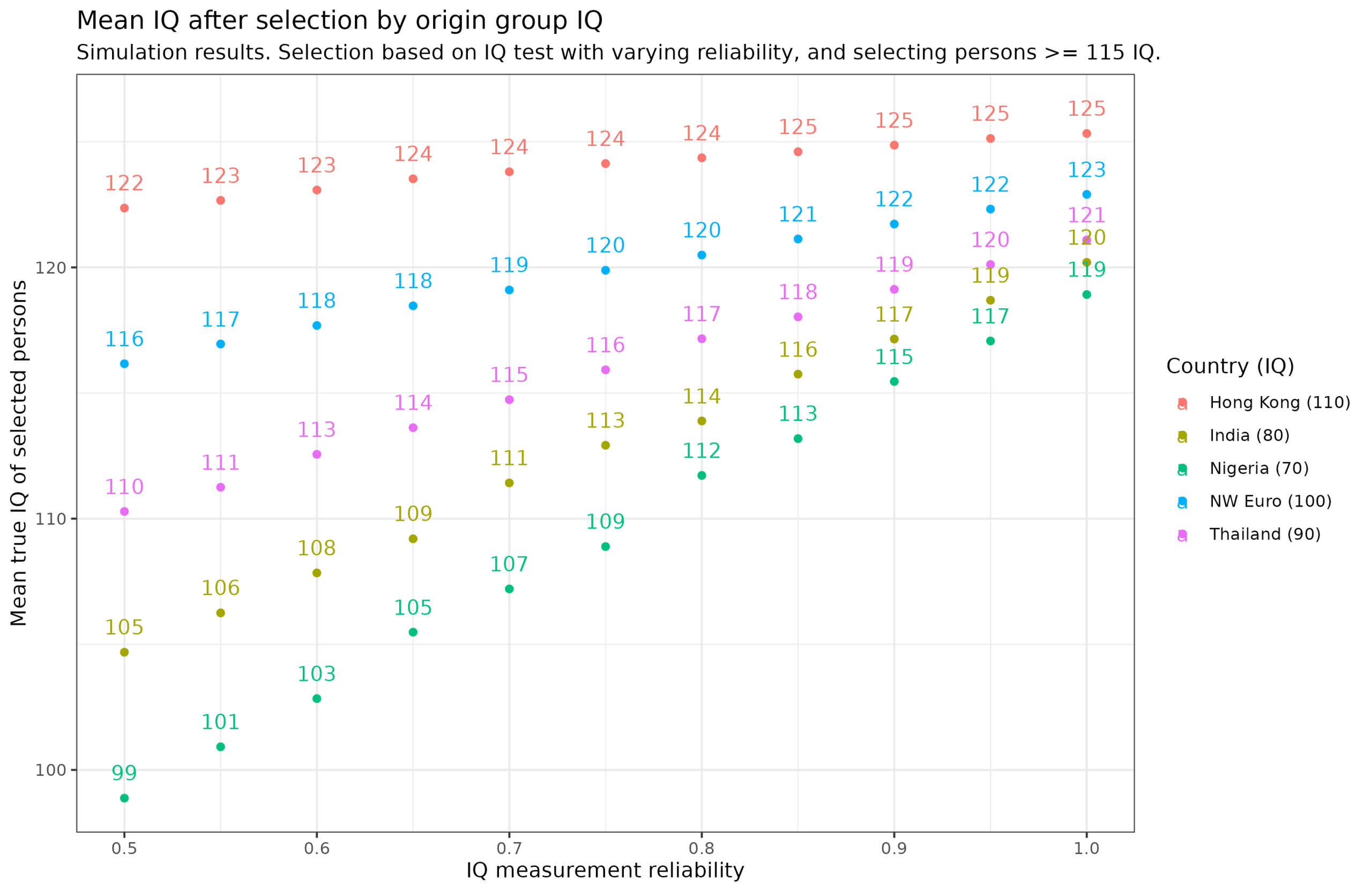 Perhaps a realistic practical immigration composite score might correlate at 0.60 with the intended target trait (‘human capital’). If we set our target at professionals defined as 115+ IQ (the top 16% of the population), we can see the effects of varying the reliability of the test. It can look dire. If the test only has 0.50 reliability, even selecting Nigerians for a putative 115+ score filter yields a mean true IQ of the selected group of only 99 IQ. It is only at reliability = 0.90 that the selected Nigerian group achieves a mean of 115. The same story holds for the other groups, just less extremely. On the other hand, for Hong Kongers, it hardly matters what the reliability is. This is a lesson: you don’t need to do a lot of selection if the human capital is already high. You could in fact do no selection at all and end up with a mean of 110. This is cheap and effective.