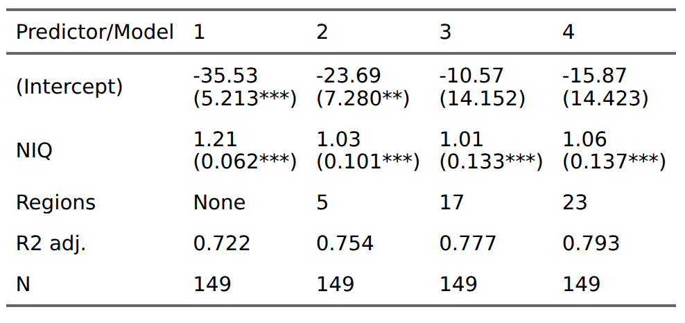 Now the NIQs are more predictive instead of less predictive when we add regional controls. This pattern of results suggest that regional non-IQ differences are obscuring some of the validity of the NIQs, once measurement error is taken into account. This isn’t so surprising because these differences include the amount of capitalism, recent communism, cultural values, any psychological traits that differ by population other than intelligence, and so on.