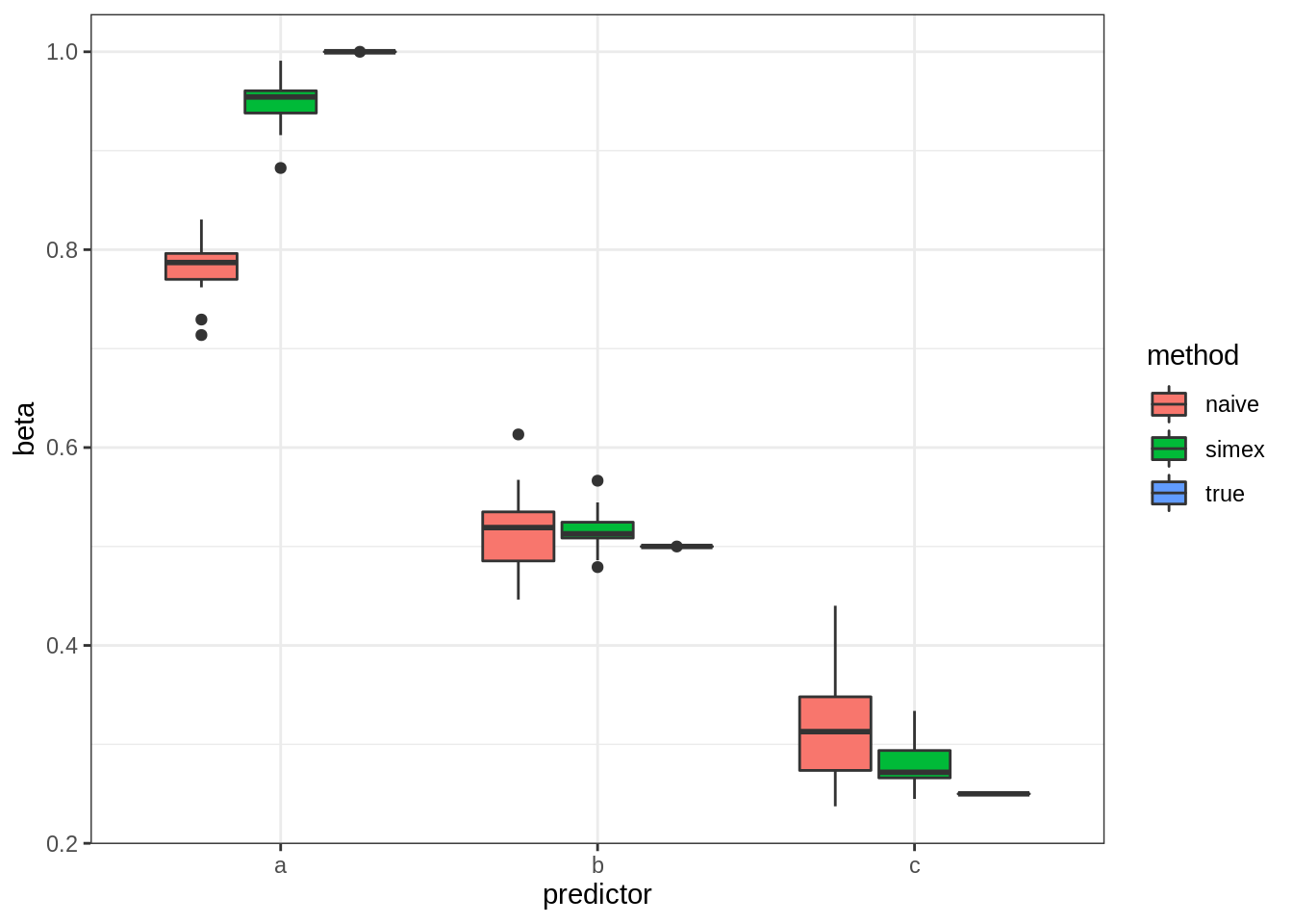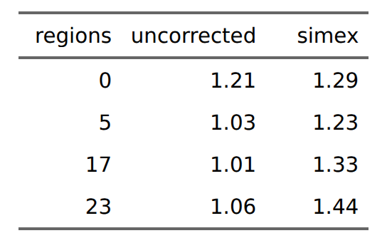 In this case, we assume for our observed regression results that given a standard error of 1.0 (average), the beta is about 0.8. If we add more random noise, we see the slope decreases towards 0.6. Using the values we see for increasing amount of errors, we can fit a model to project what the true beta should be if the error was 0, which in this case is about 1. These are in fact simulated data where the true beta is 1 (model simex estimated ). This method is entirely general and can be applied to regression models with any number of terms. Simex will then try to figure out the respective true slopes by adding varying amounts of noise to each predictor with some assumed measurement error. This is also why it is called the “simulation and extrapolation method”. In general, simex isn’t perfect. Here’s some results from my simulation: