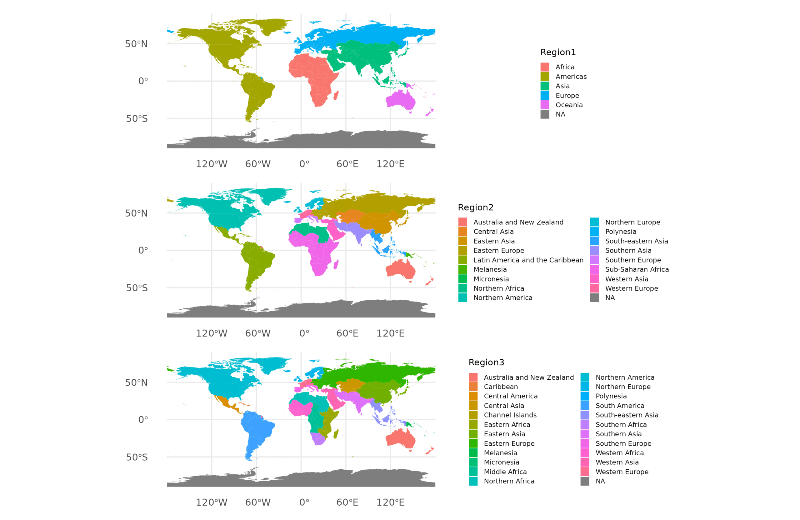 If you squint, you can find some slopes that are not possible or the same value. However, the confidence intervals are also wide, especially for the smaller regions which only have a few countries. There are two formal ways to examine this idea. The first and most strict is to fit proper fixed effect models (fixest package). These take the data by region, then remove the means of the variables, and then compute the slopes, and then average the results with appropriate weights. However, the values are the same as OLS in this case (they usually are, but if one has weird data, then maybe not). We can also try the random effects model from lmer package. This can in theory model the slopes as being different by region. Fitting the models, however, showed that they all fail to detect any slope differences beyond chance (all models were singular).