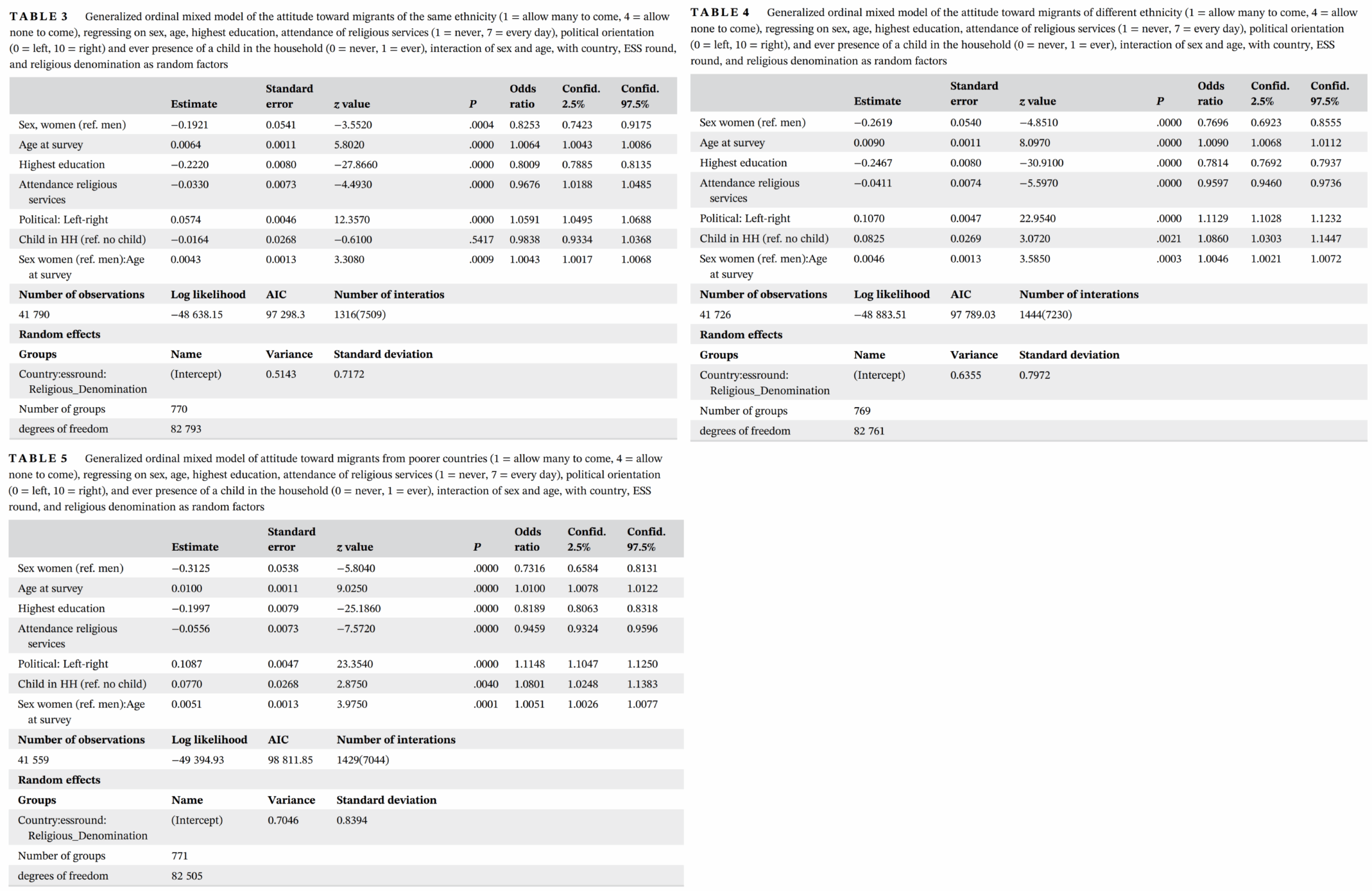 So it’s an ordinal scale as we can maybe not assume that these 4 options are equally distant in some ‘migrant opinion’ trait space. As such, they use ordinal regression, but probably linear regression would give the same results with higher precision. Their models: