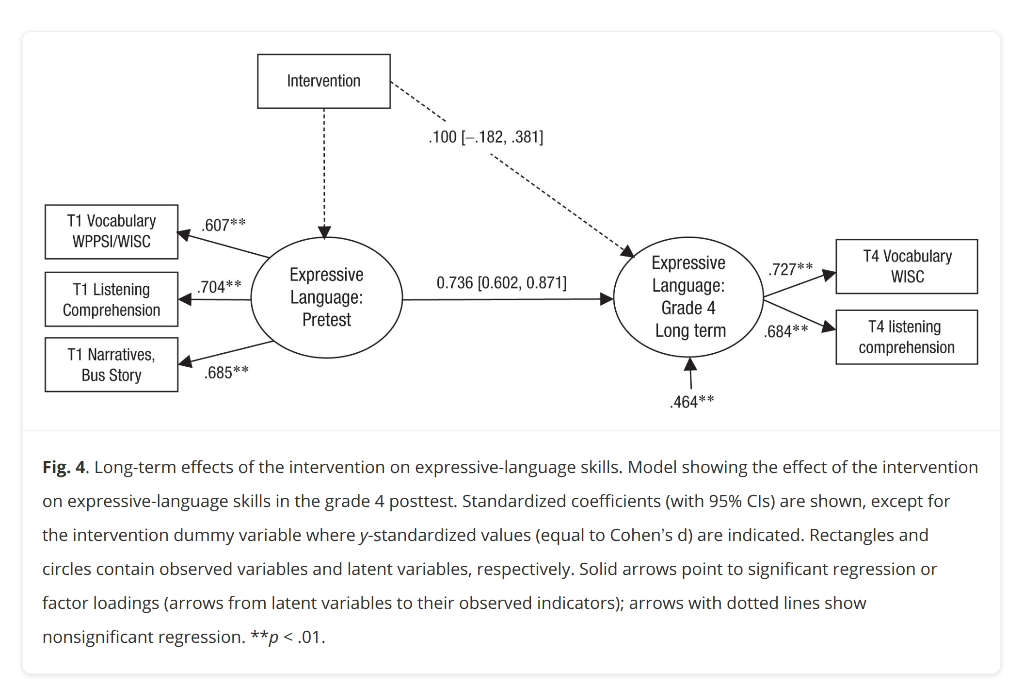 Thus after 7 months, there was an average gain of about 0.50 d on their language ability latent score. There was also an interaction such that subjects with initial weak skills gained relatively more (the interaction variable is being +1 in initial ability). However, after 4 years:
