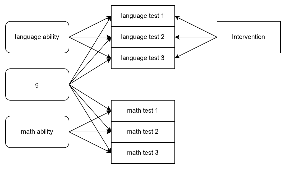 In this case, we have 6 tests — 3 tests for math and 3 for language — that are caused by 3 abilities (latent). The underlying abilities are orthogonal (uncorrelated) in the bi-factor model, so language ability here means non-g language ability (degree of verbal tilt). The intervention is language training aimed at improving subjects’ language skills, say, vocabulary, listening, and reading. It is not expected or designed to improve subjects’ math ability hence no causal lines. This also means there is no far transfer (training on one type of test improving unrelated tests). Far transfer would suggest an increase in test scores that results from an increase in g itself since any g increase would affect any cognitive test given in proportion to their g-loadings.