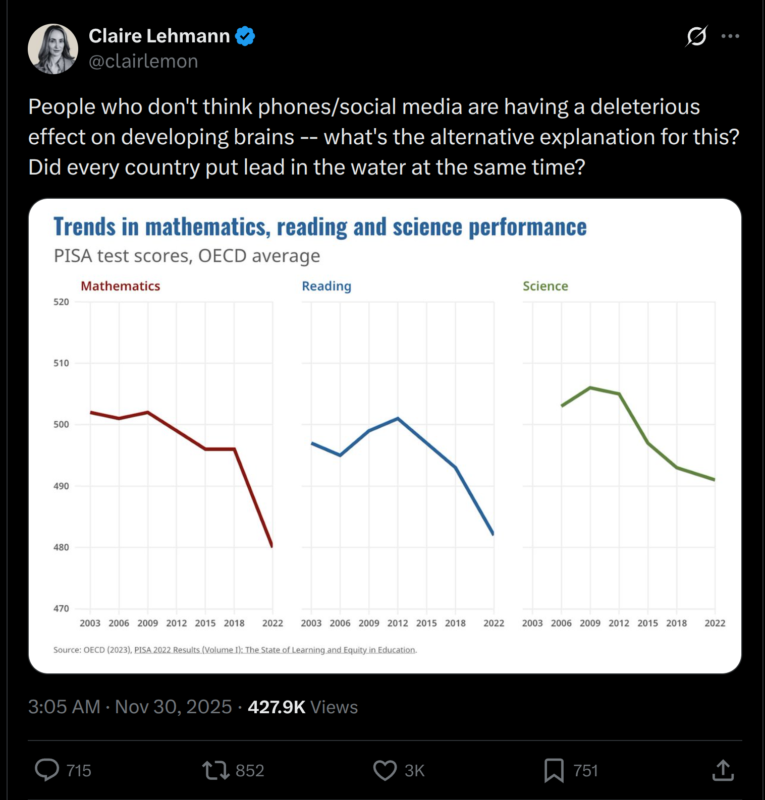 I couldn’t find the source of that particular PISA plot that Claire Lehmann posted. However, I did what presumably most commenters didn’t: I skimmed the actual PISA reports, both the main one and the technical one (~1000 pages combined). In them, one can find a plot like the one floating on X: