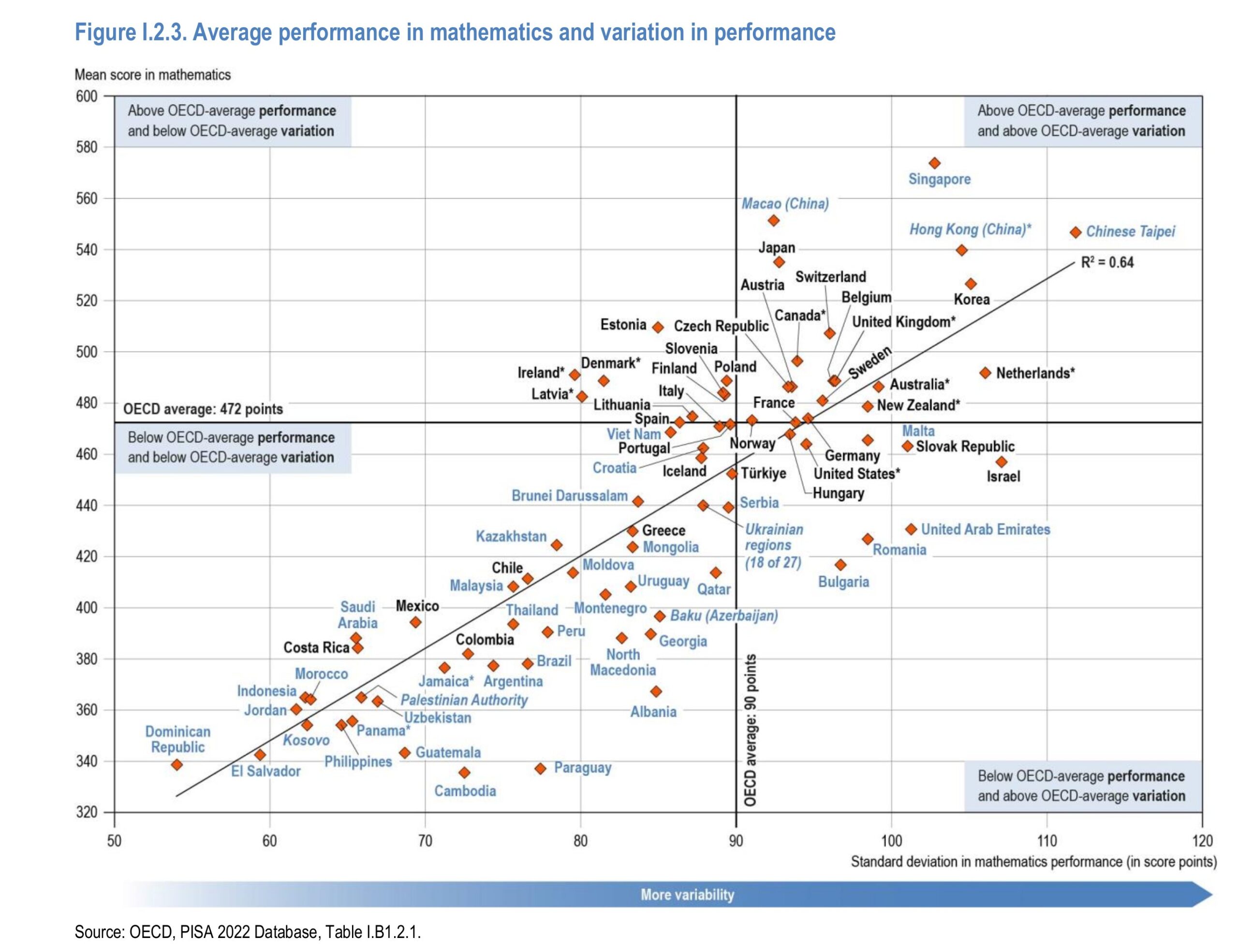 So it turns out that the countries with larger inter-student differences (here in standard deviations) are also those with higher average scores. This sounds like what one would get by not following their equity agenda and instead spending some resources on gifted education (and less on remedial/special education). This relationship between variability and means has also been noted for sex differences by Inquisitive Bird.