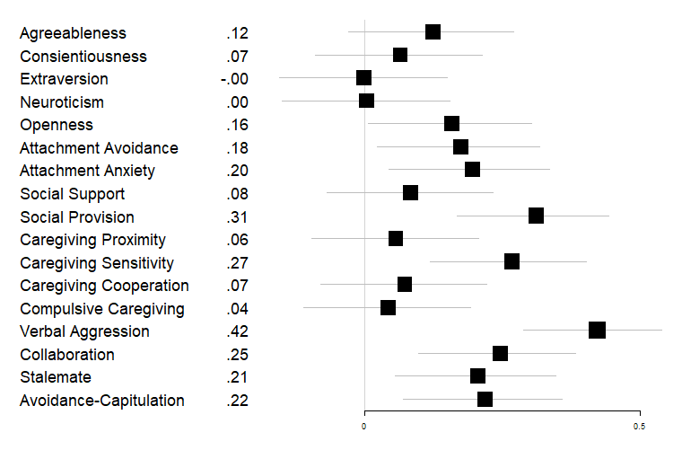 The assortative mating correlation for neuroticism is in fact 0 in this sample, which we suspect to be false given the known mental health diagnoses assortative mating. I think it’s a self-report data issue, but I haven’t seen a study that looked at this specifically. Very few datasets have both self- and other-reported personality data for couples with which one could test this. It’s curious that verbal aggression showed the strongest AM effect (0.42) while agreeableness was minor (0.12), when these conceptually measure quite related things.