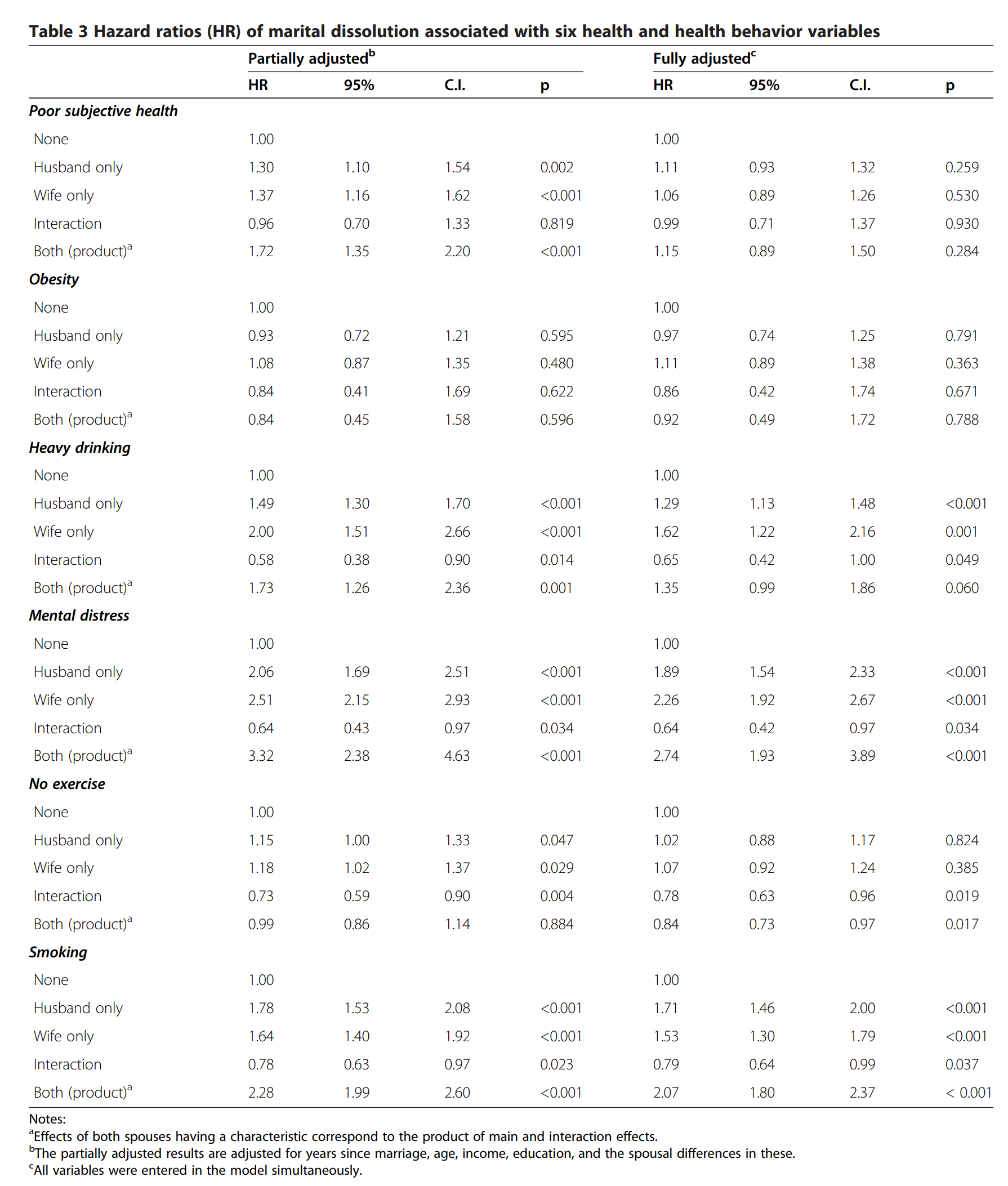 The data come from a general population sample (19,827 couples) and 15 years of follow-up data on marital dissolution. The following characteristics were investigated: Poor subjective health, obesity, heavy drinking, mental distress, lack of exercise, and smoking. Associations between these characteristics among husbands and wives and later divorce were investigated with Cox proportional hazards regression analyses.Results
