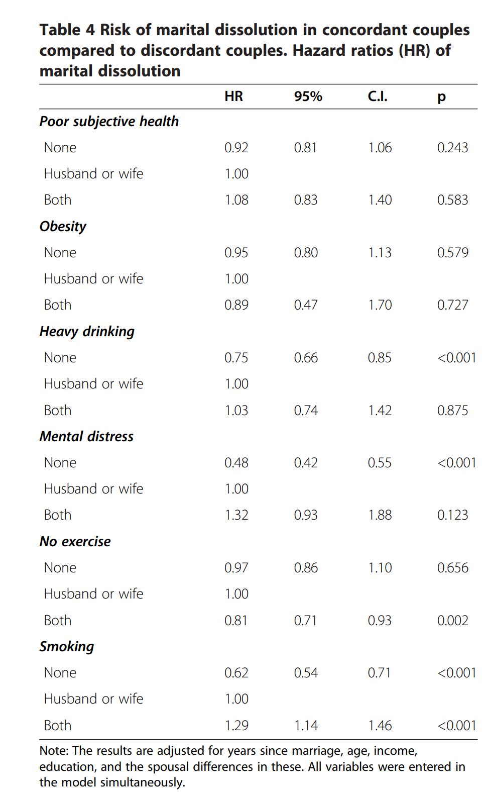 All the investigated characteristics except obesity were associated with marital dissolution. Moreover, spousal similarities in four of these characteristics (heavy drinking, mental distress, no exercise, and smoking) reduced the risk of divorce, compared to the combined main effects of husbands and wives. Nevertheless, couples concordant in these health issues still had higher risks of divorce than couples without these characteristics.Conclusion
